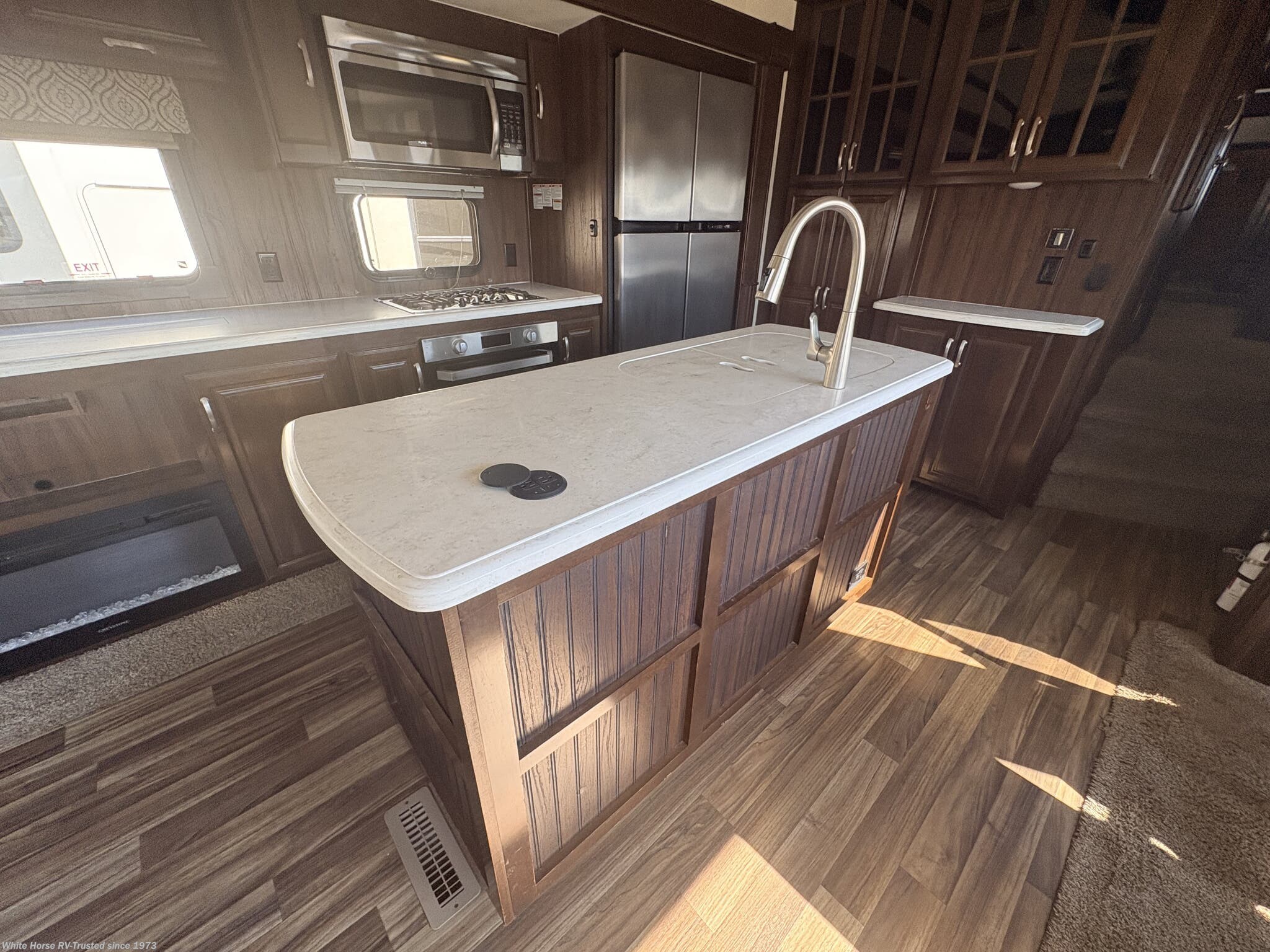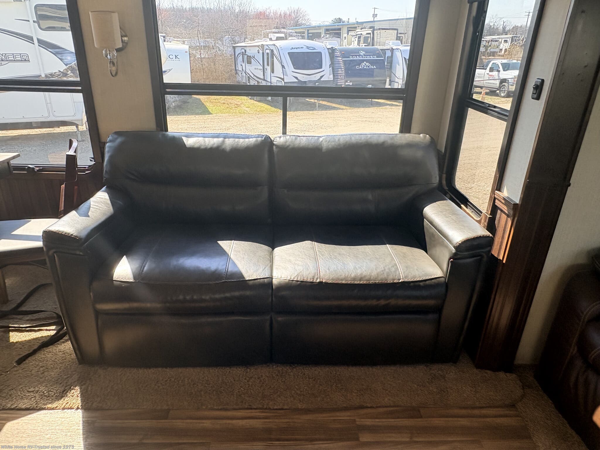 - Features 3 spacious slide-outs, theater seating, hide-a-bed sofa, & electric fireplace