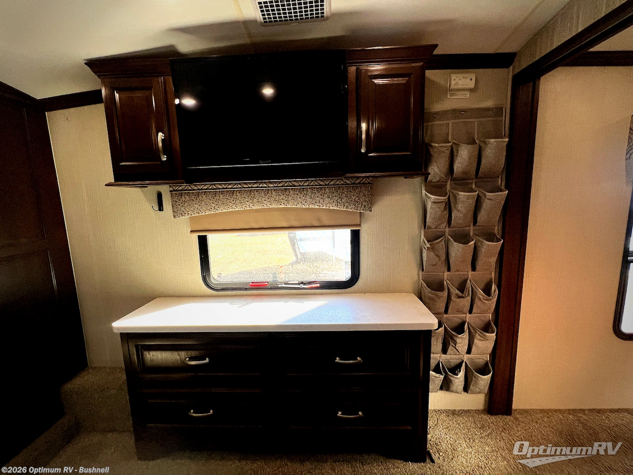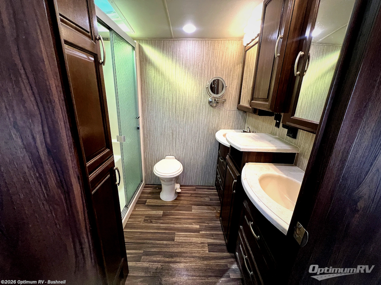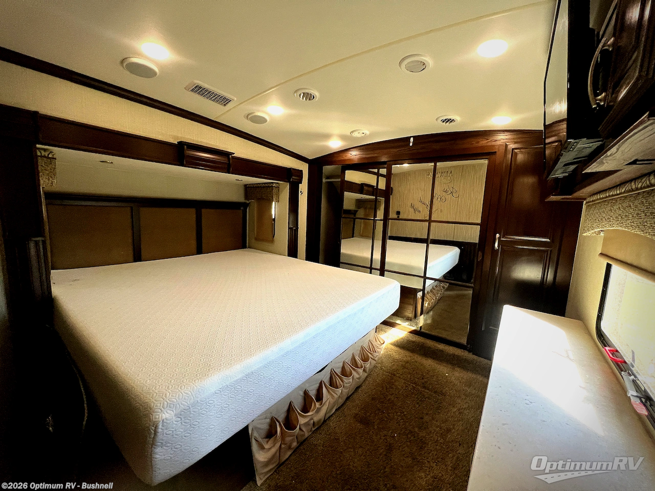 At the entry door you can head up the steps on your right to a side aisle bath and front master bedroom. The bath offers you a large shower, a toilet, and vanity with double sinks. There is also a linen cabinet as well. A sliding door leads into the front master bedroom where you can choose between the standard king size bed slide, or optional queen. With the queen size bed you also gain a nightstand for your personal belongings. Opposite the bed you will find a dresser for your clothing along with a 32" LED TV, and along the front wall a wardrobe, some drawer space, and a closet that has been prepped for a washer and dryer, plus so much more!