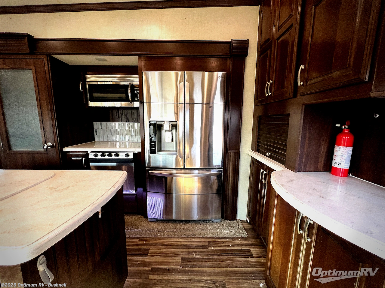 Cooking will be a breeze while camping in this Cardinal fifth wheel with a slide out pantry, a three burner range with overhead microwave oven, and a three door stainless steel refrigerator. There is also a kitchen island that features a double sink, plus the added countertop prep space. You will also find more cabinetry and storage for your things in the hutch along the interior wall straight in through the entry door.