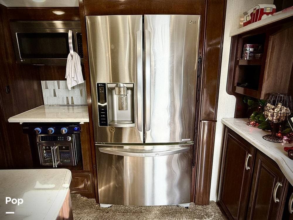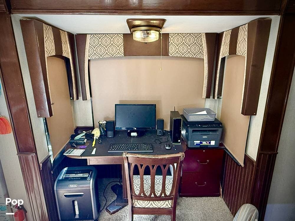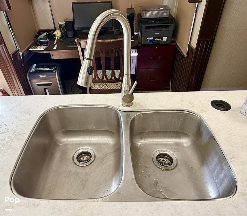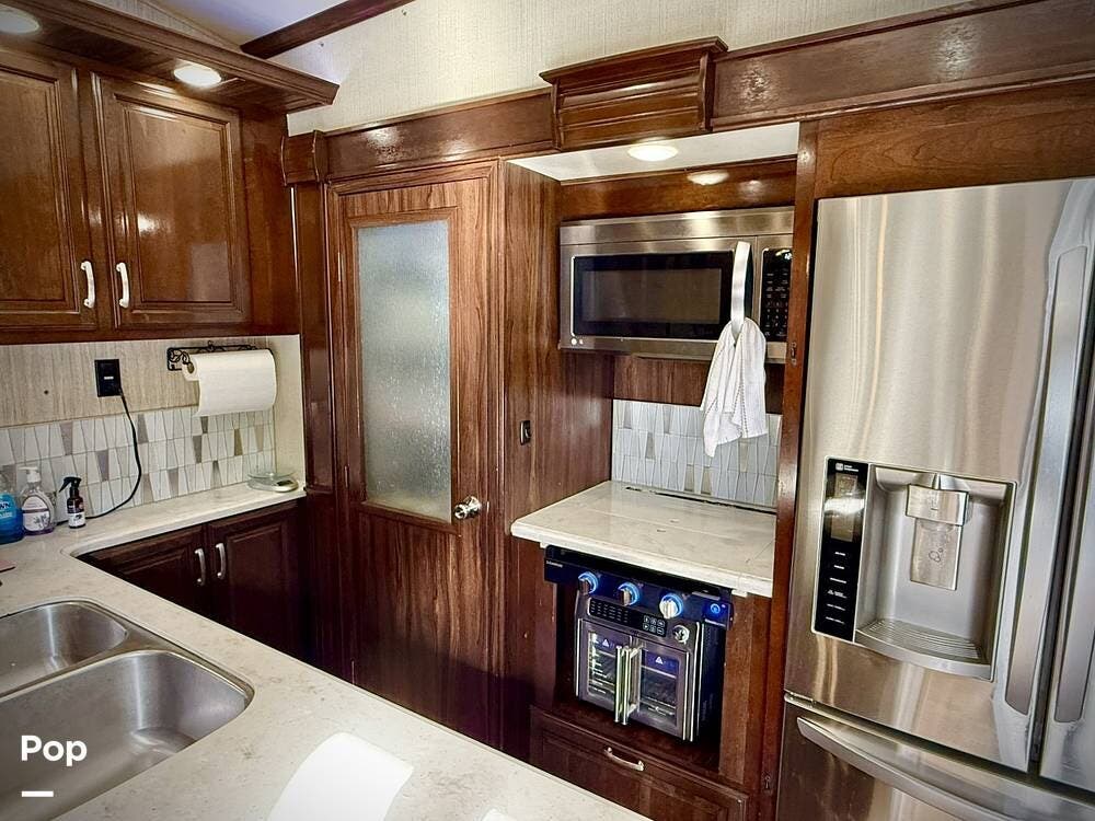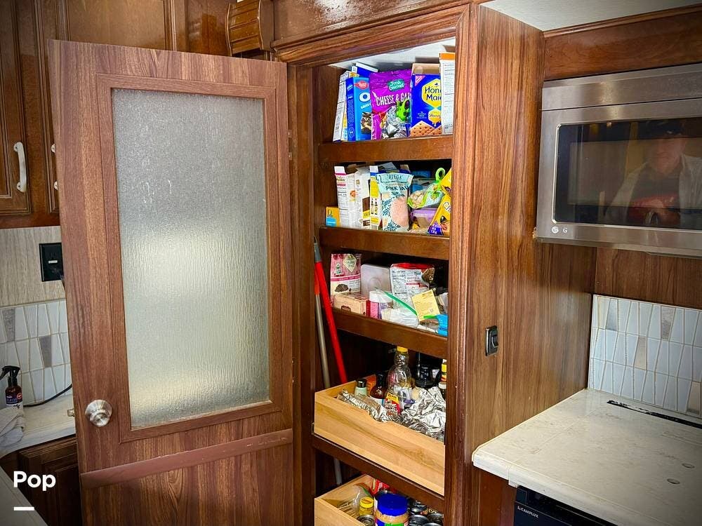 Step down into the expansive kitchen and dining area where you'll find residential-style finishes throughout. The dual opposing slides open up the space beautifully, with a free-standing dinette (currently converted to an office), a center peninsula with a deep sink and extra prep space, and a full suite of stainless steel appliances, including a three-burner range, convection microwave, and a spacious three-door refrigerator. A large pantry and hutch provide ample storage for all your kitchen essentials.