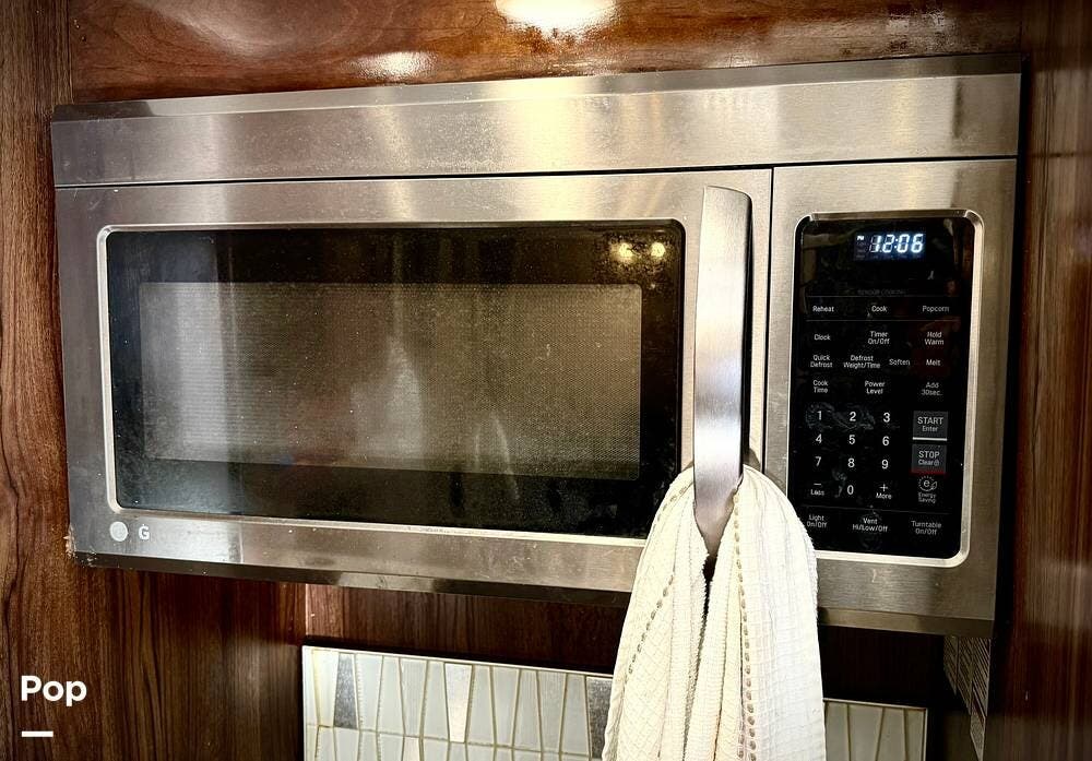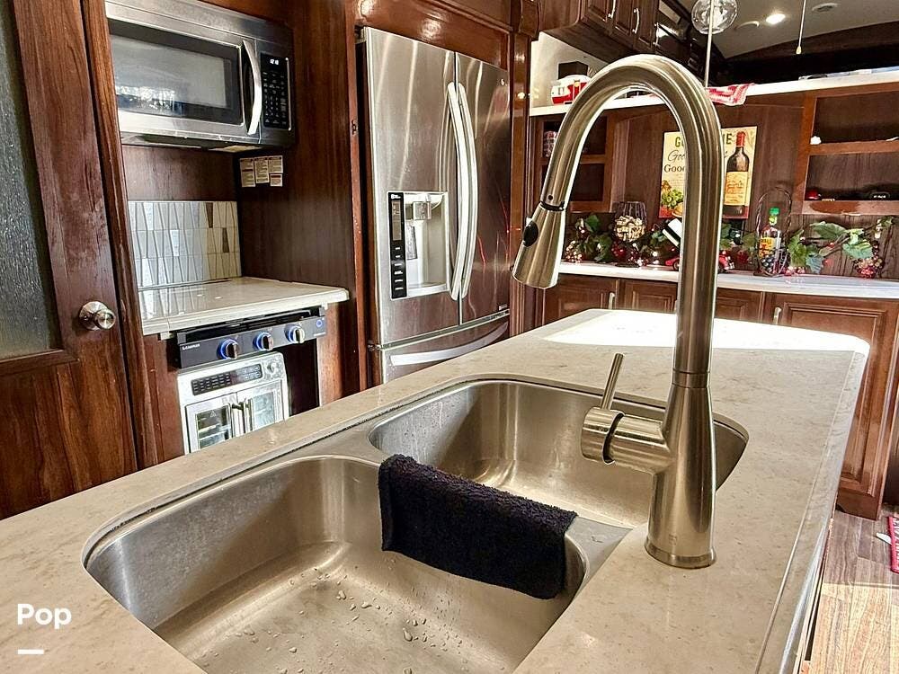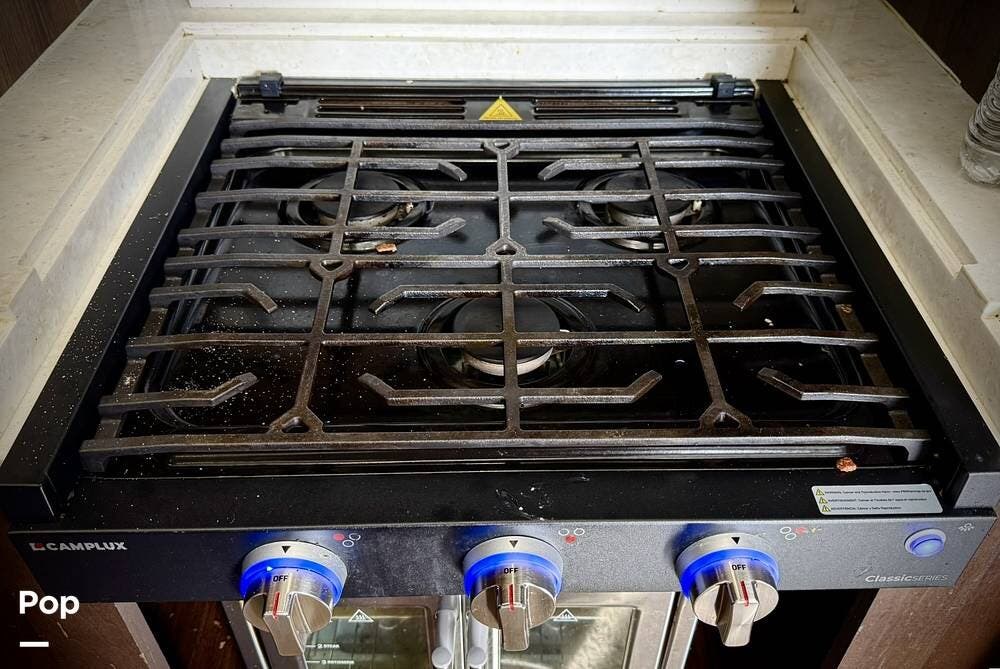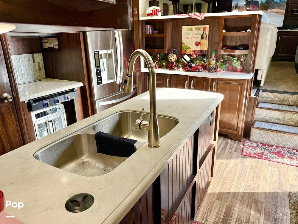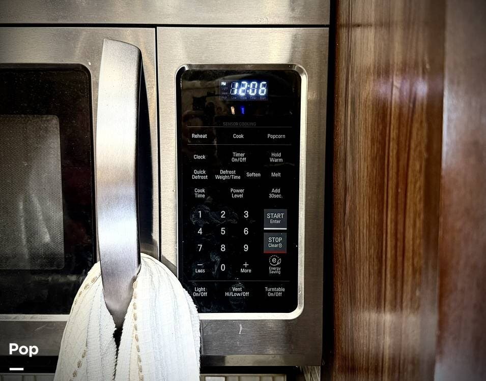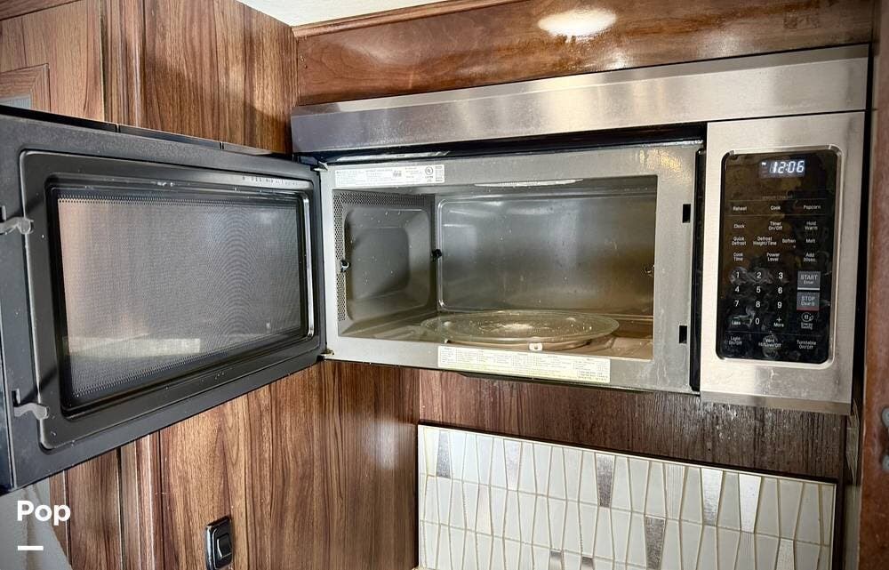 Step down into the expansive kitchen and dining area where you'll find residential-style finishes throughout. The dual opposing slides open up the space beautifully, with a free-standing dinette (currently converted to an office), a center peninsula with a deep sink and extra prep space, and a full suite of stainless steel appliances, including a three-burner range, convection microwave, and a spacious three-door refrigerator. A large pantry and hutch provide ample storage for all your kitchen essentials.