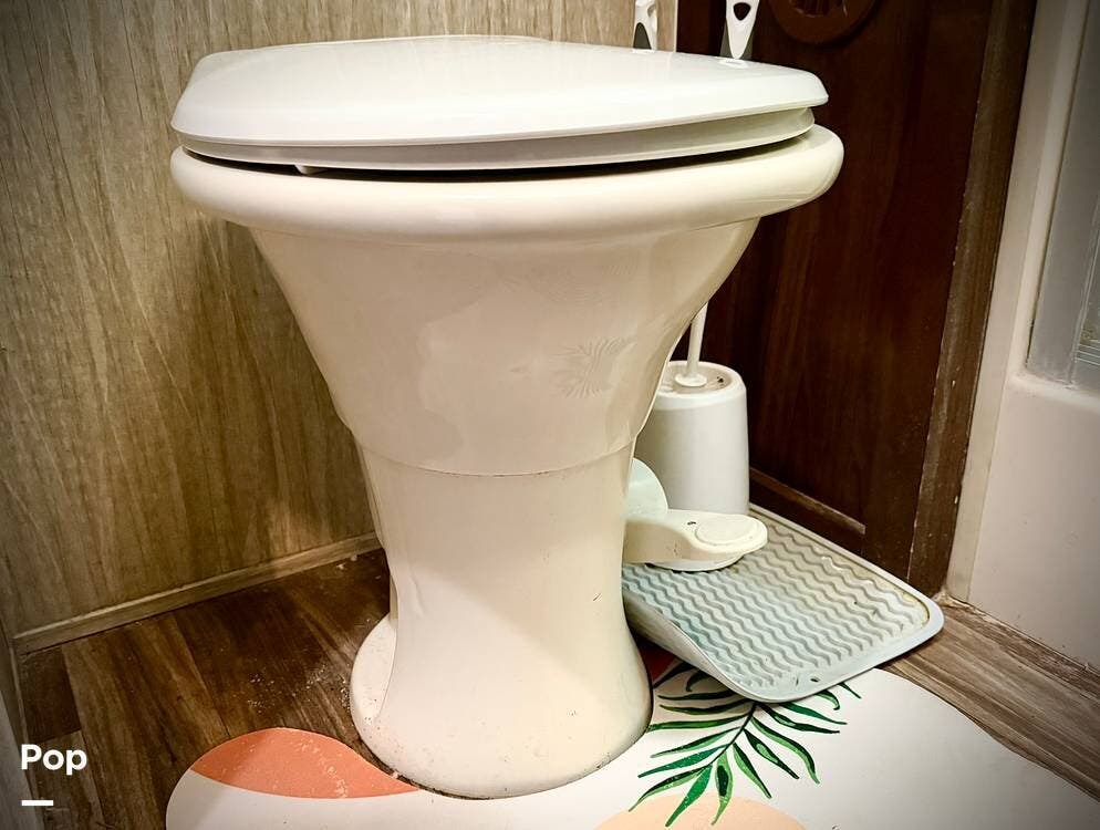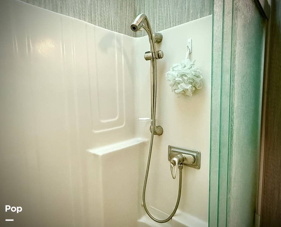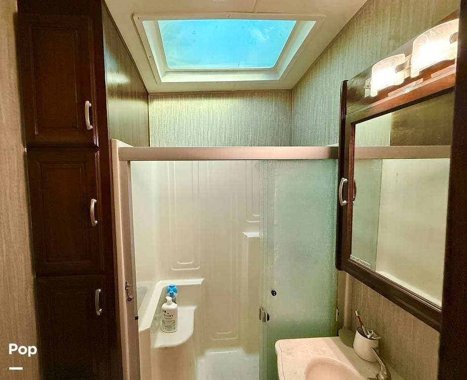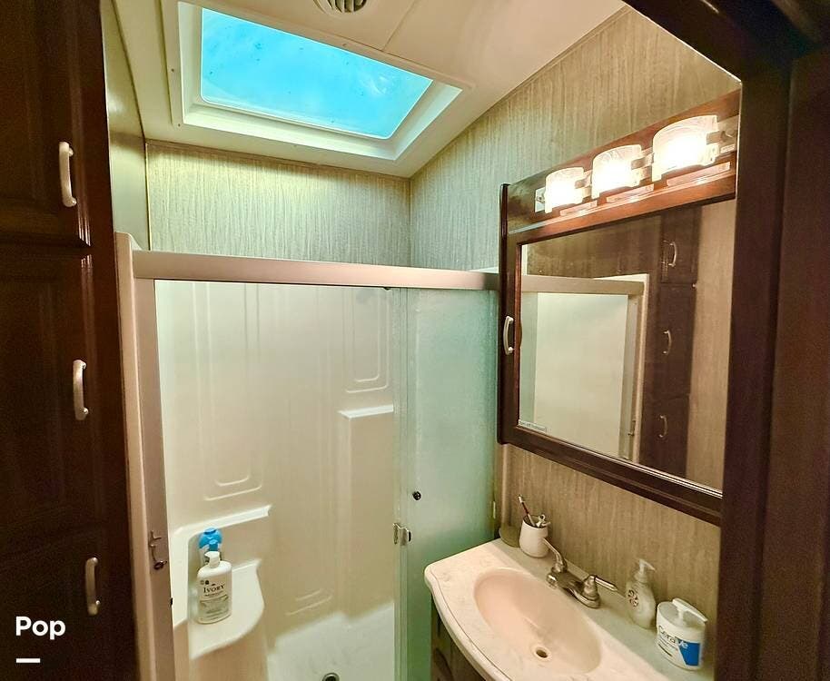 The side-aisle bath features a full-size shower, a vanity with a medicine cabinet, linen storage, and a porcelain toilet, giving you all the comforts of home on the road.