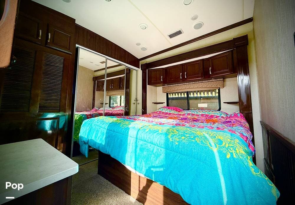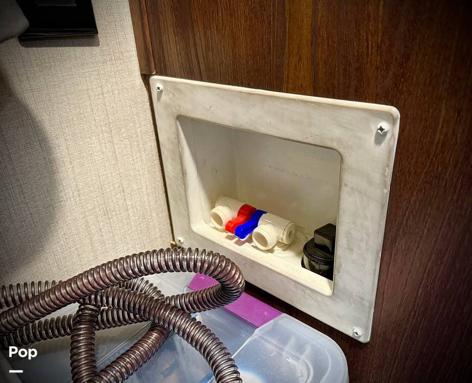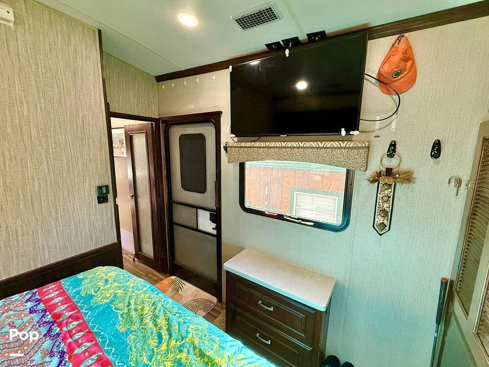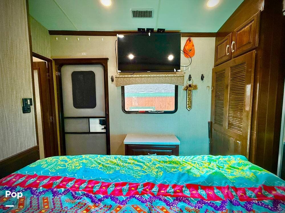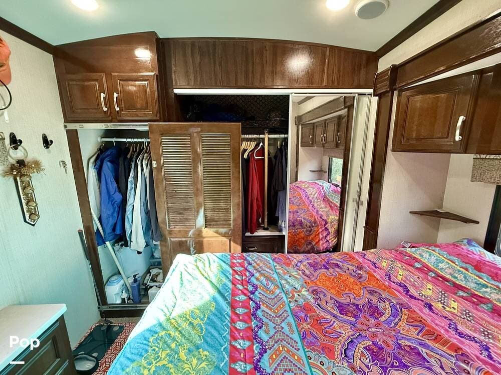 At the rear of the fifth wheel, retreat to the luxurious master suite with a king-size bed on a slide, a dresser, a full wardrobe, and a closet prepped for a washer and dryer. Multiple storage options and elegant finishes make this bedroom a true sanctuary.