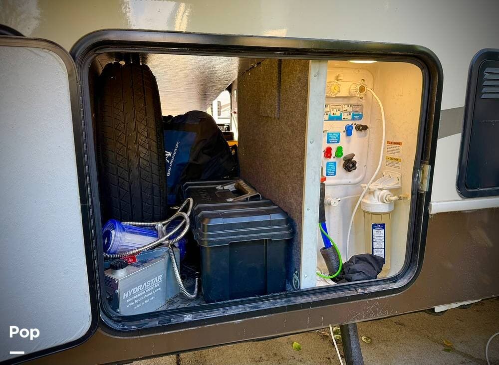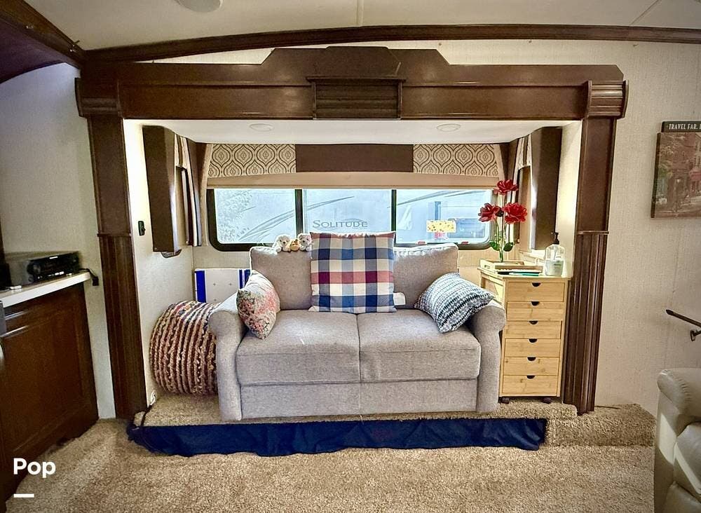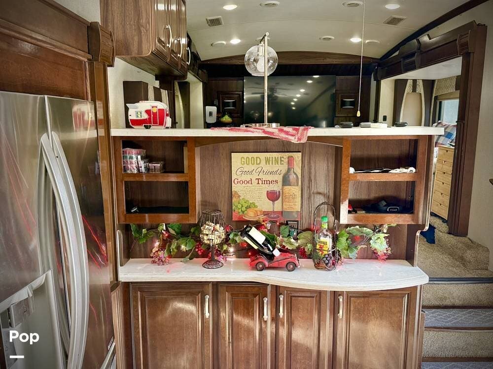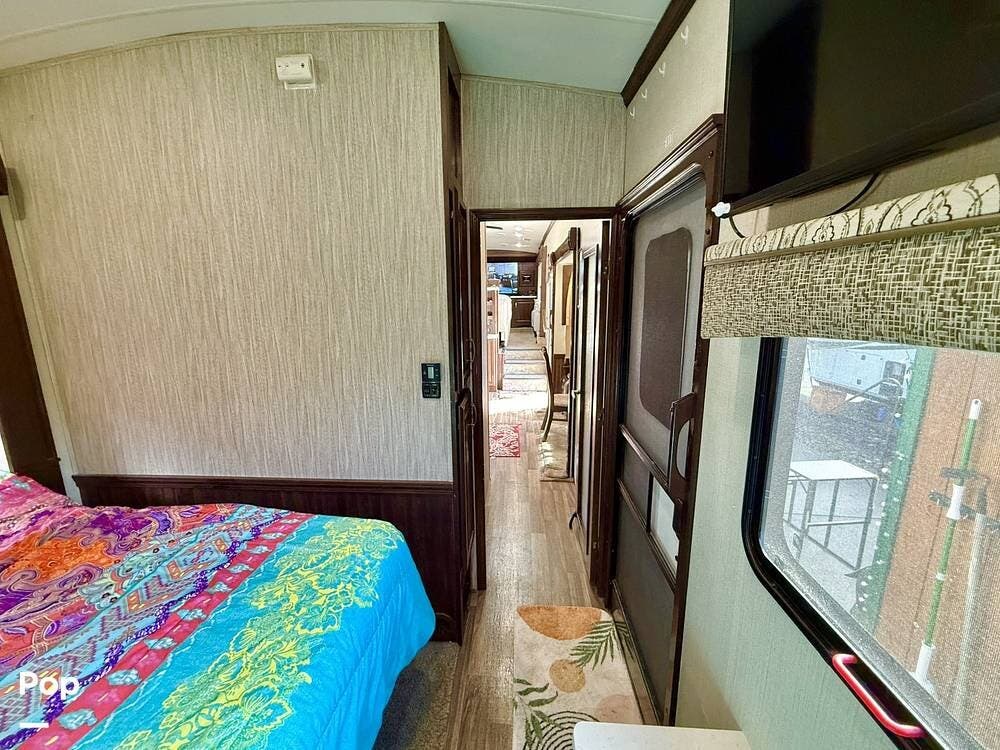 At the rear of the fifth wheel, retreat to the luxurious master suite with a king-size bed on a slide, a dresser, a full wardrobe, and a closet prepped for a washer and dryer. Multiple storage options and elegant finishes make this bedroom a true sanctuary.