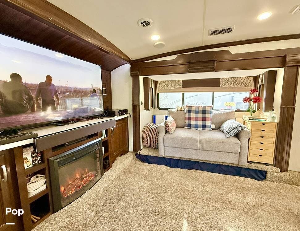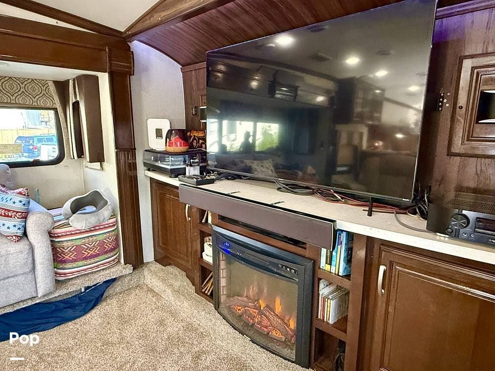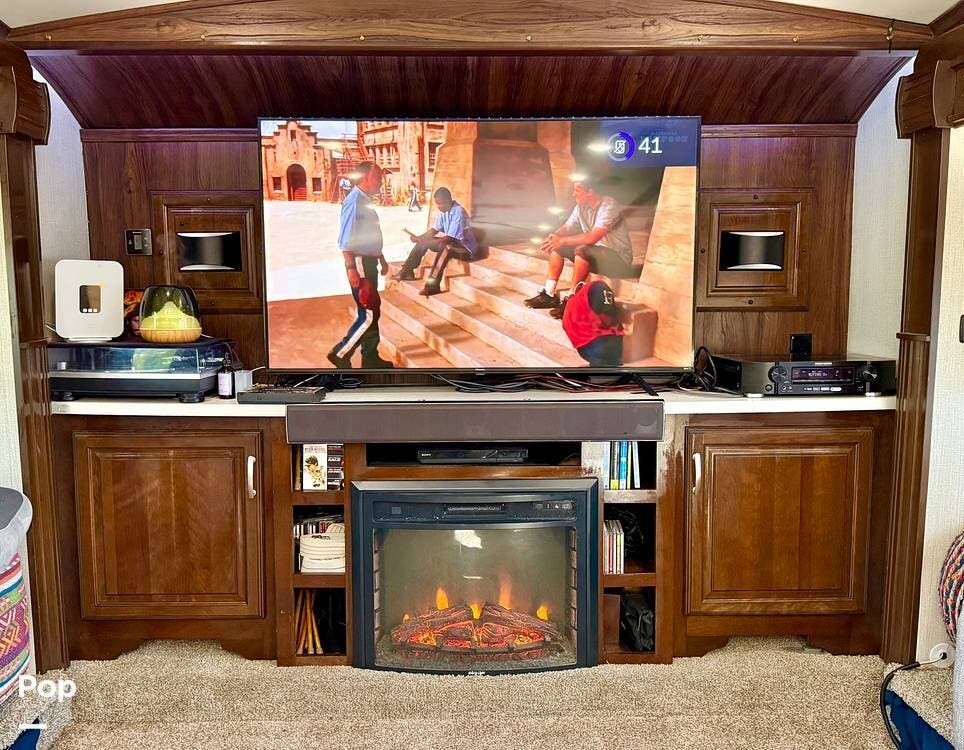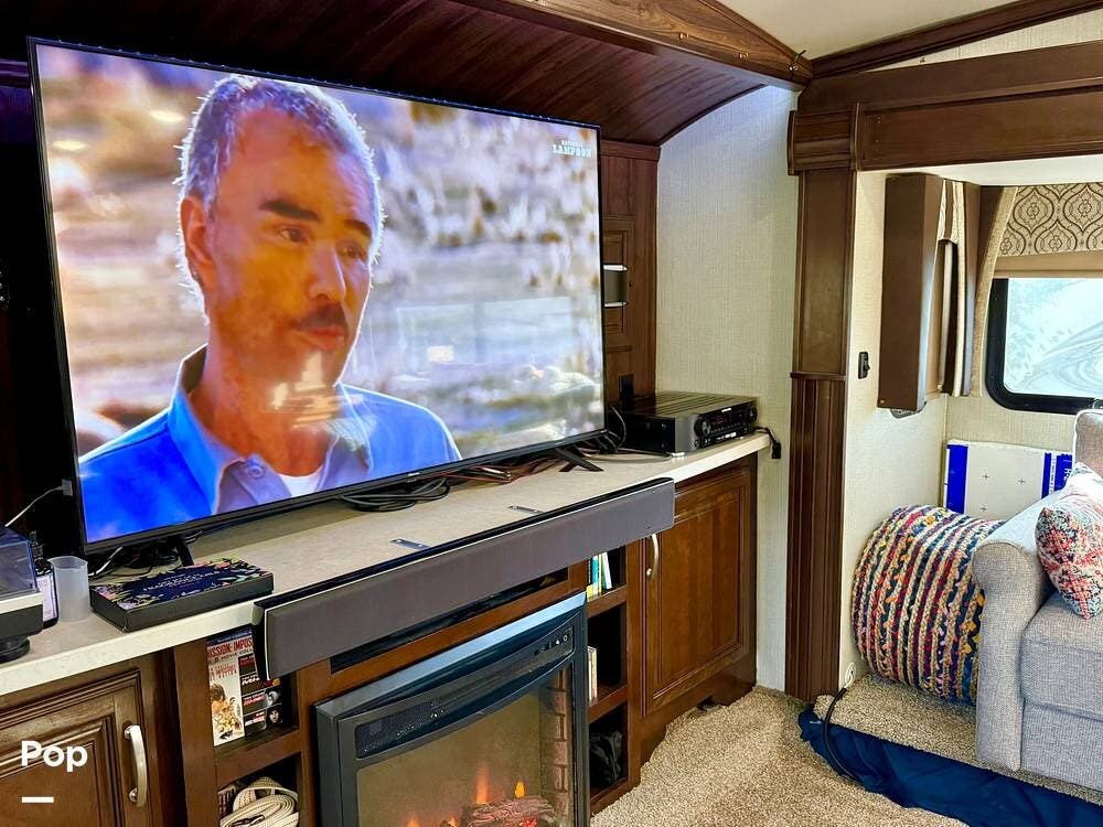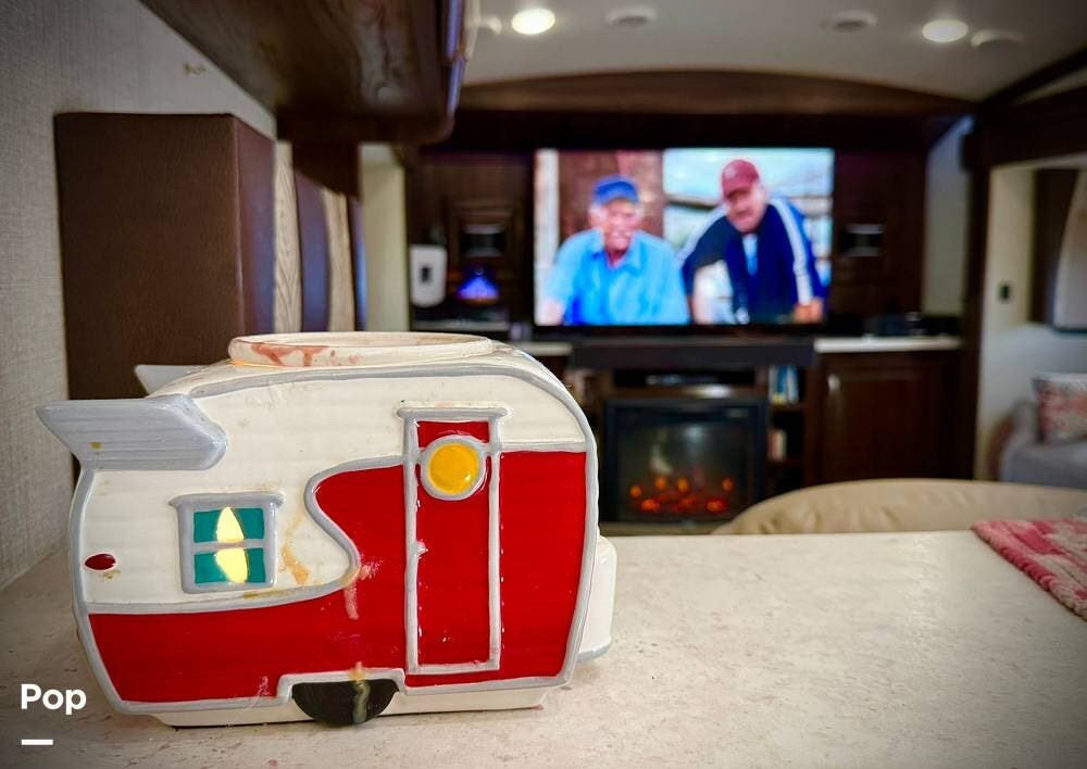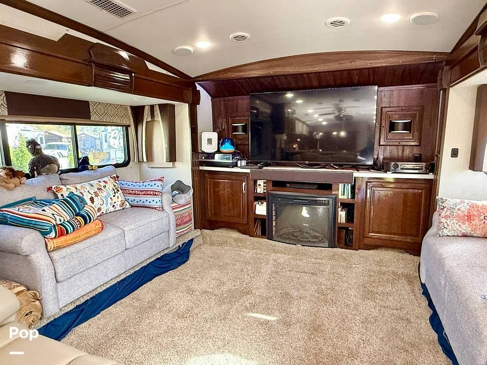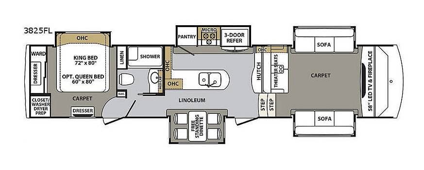 Perfect for entertaining family and friends, the 3825FL offers an inviting front living area with dual opposing slide-outs, two plush sofas, and cozy theater seating. The entertainment center, complete with a 58" LED TV and electric fireplace, creates a warm and relaxing atmosphere ideal for movie nights or conversation after a day of travel.