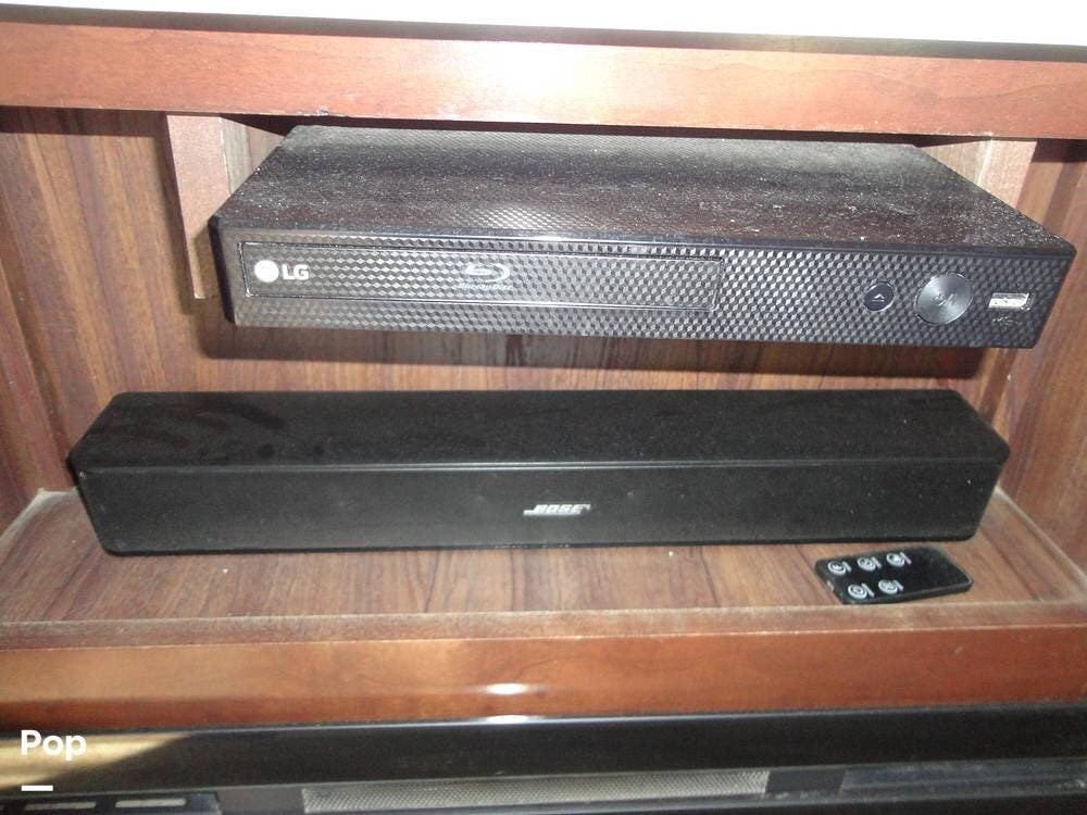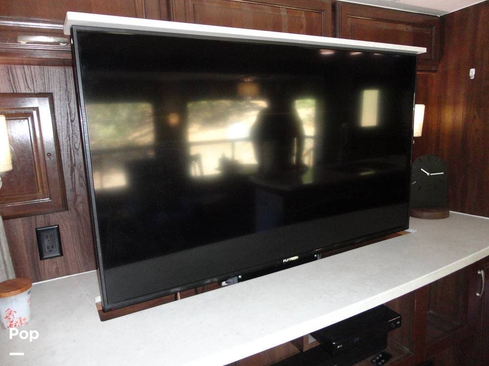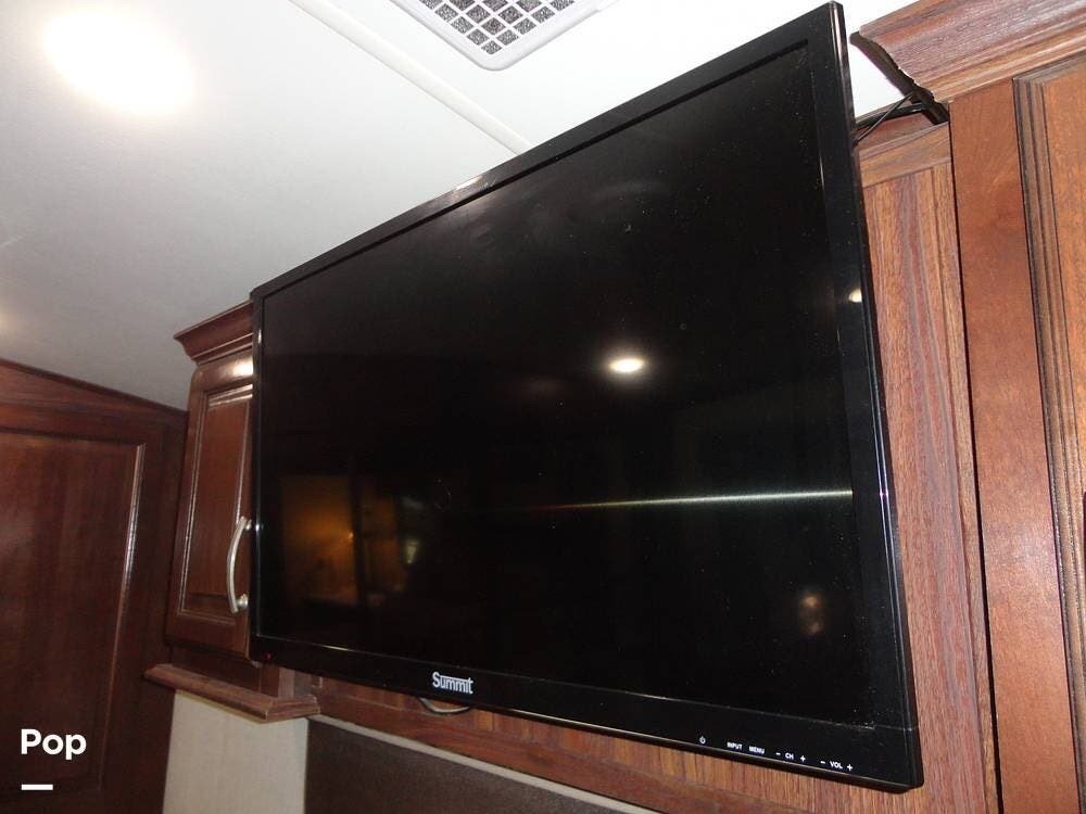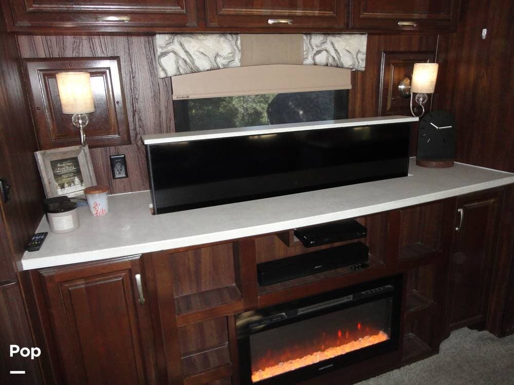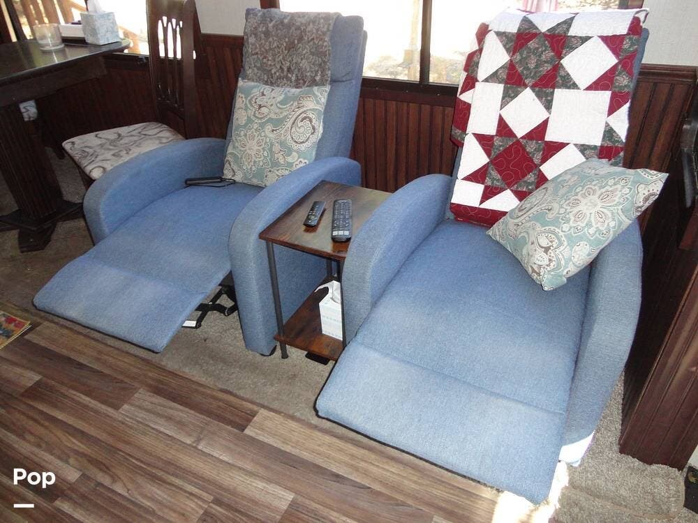 The Cardinal's interior provides a rear lounge floorplan with a large rear living space featuring recliners, a sofa/sofa bed, an entertainment center with a 60" TV, and a fireplace for a cozy atmosphere. There's two additional TVs...one in the bedroom and one outside in the patio area.