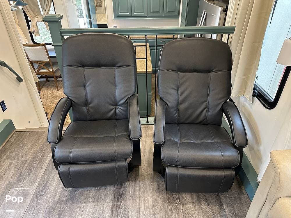 The 38FLX features an impressive six slide-outs that transform this fifth wheel into a living space that feels nothing like a trailer. Both sides of the front living room extend outward to create a wide-open great-room feel, with one tri-fold sofa and a La-Z-Boy wall-hugger love seat with individual footrests surrounding the 36-inch electric fireplace and 55-inch swivel LED television. The mid-section slides open the kitchen and living area, and the two rear slides give the king bedroom the kind of space you would expect in a much larger unit. When everything is out, this coach lives big.