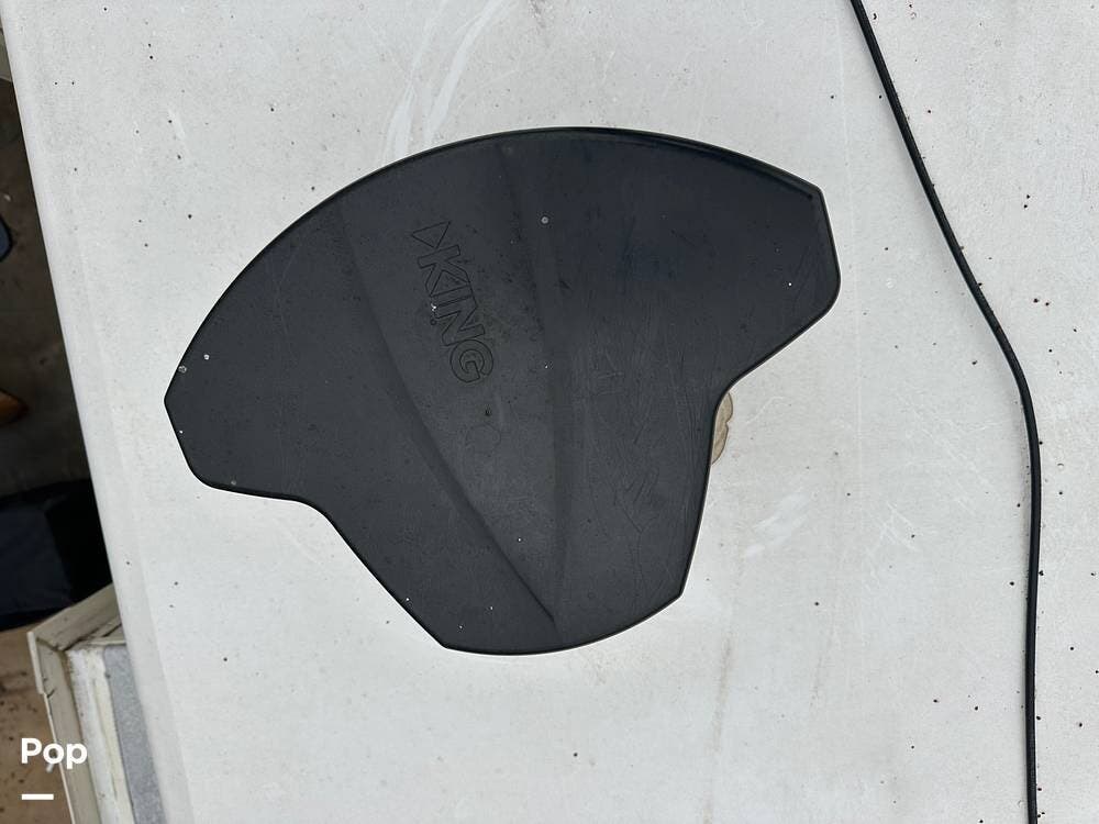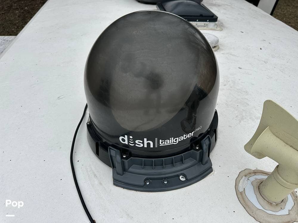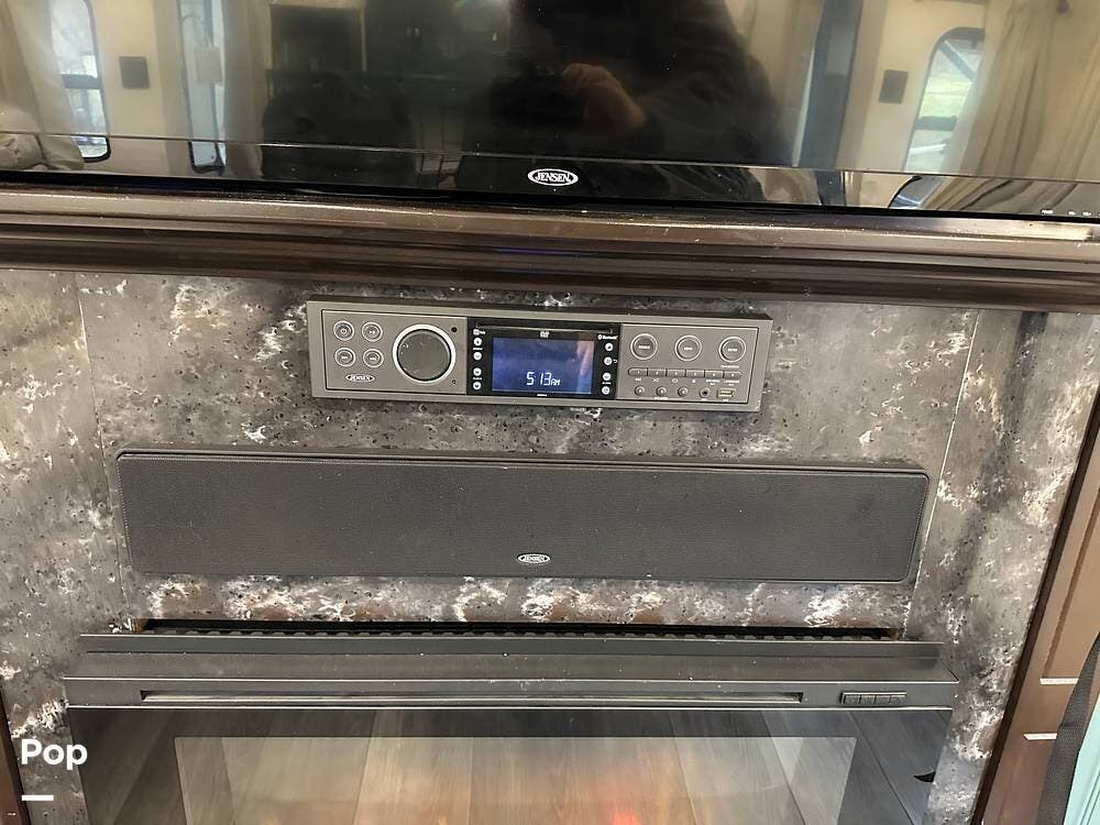 The entertainment package is hard to beat. The Jensen Home Theater System integrates fully with smart devices, including Apple, features a 12-volt sound bar with two mid-tone speakers, two tweeters, two subwoofers, and two outside speakers, and includes a CD and DVD player with AM/FM stereo and weather band. You can control the entire system from your phone using the J-Control app, whether you are inside or sitting outside under the awning. A King satellite dish compatible with Dish Network is already installed, and the Wally receiver stays with the RV so you can watch your favorite channels from campgrounds all across the country.