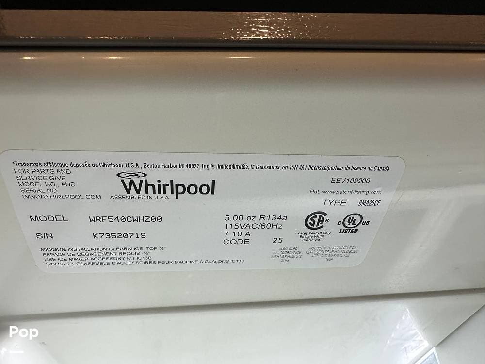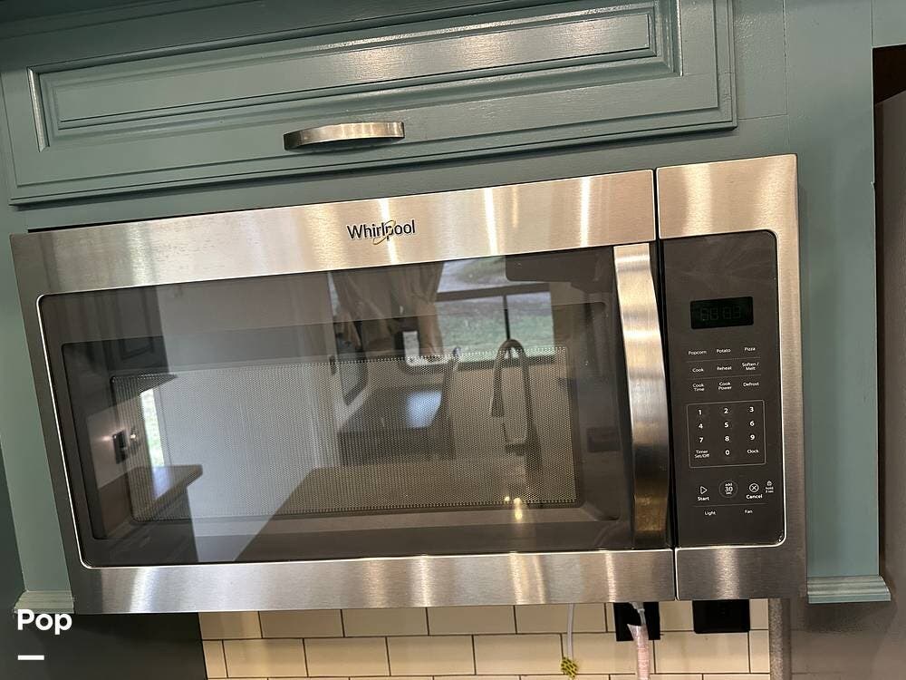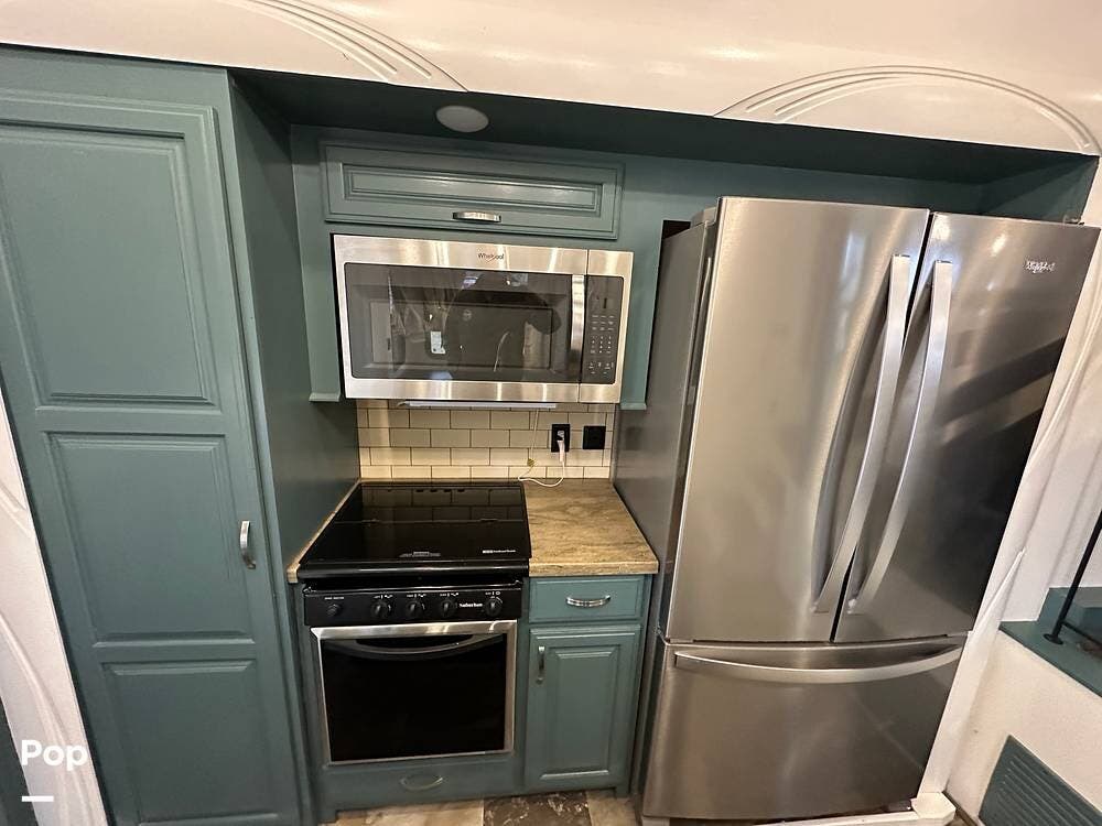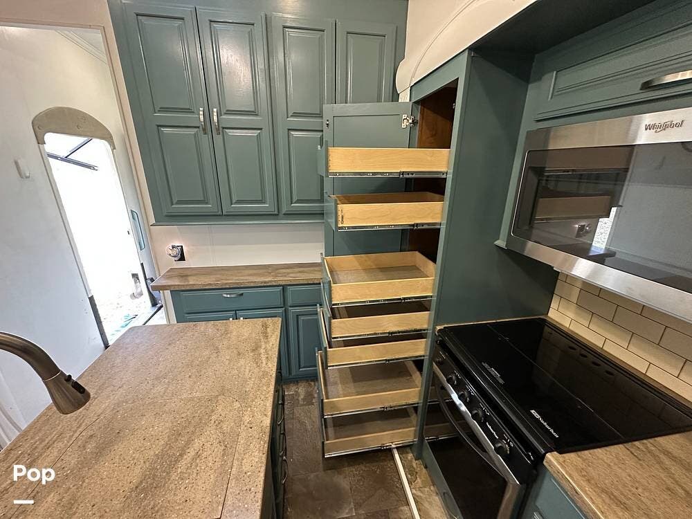 The kitchen is a cook's dream on wheels. Solid-surface LG countertops wrap around a full center island with an oversized 60/40 stainless-steel sink, giving you real workspace to prep meals the way you would at home. The full-size stainless steel oven features a Piezo igniter, sealed burners, and a double-pane glass door with an interior light so you can check on dinner without opening the oven. A stainless steel 30-inch over-the-range microwave vents to the outside, and a 19-cubic-foot residential refrigerator with a built-in ice maker and dedicated inverter keeps everything cold even when you are off shore power. A full pantry with seven pull-out drawers keeps everything organized, and a compact table that doubles as a workspace is ready for whatever your day calls for.