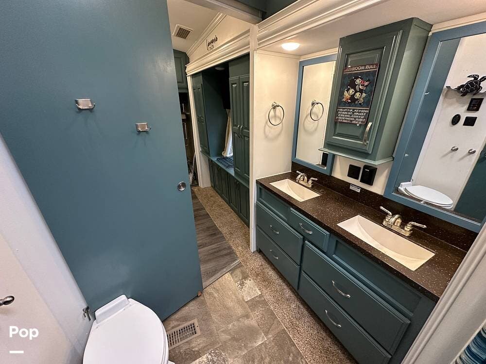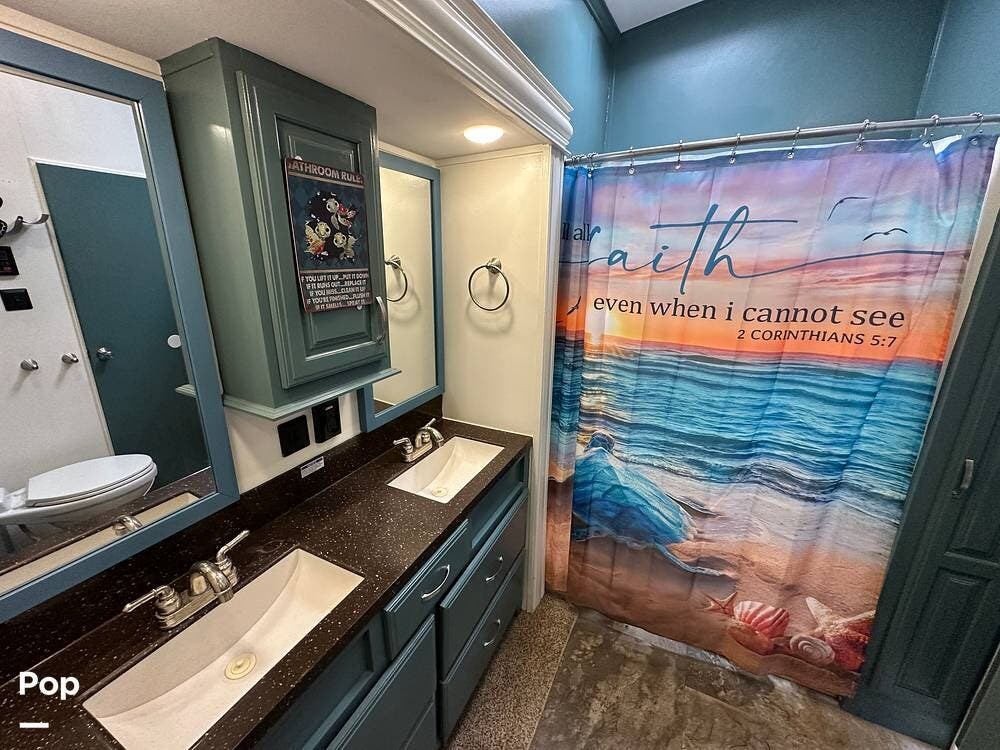 The bathroom sits just steps away, with a 48-inch one-piece fiberglass shower featuring a built-in seat, a porcelain toilet with a circular flush, and a Jack-and-Jill vanity with a double-bowl sink, four storage drawers, large framed mirrors, and generous counter space. Getting ready in the morning out here is as easy as it is at home.