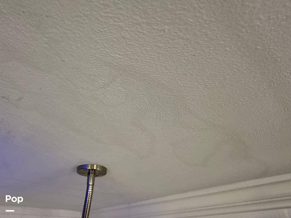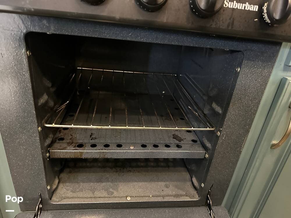 The private rear bedroom is a true retreat. A standard king-size bed with a Serta mattress fills the room, along with a dresser with an overhead television cabinet and a medicine cabinet. A 32-inch LED Jensen television means you never have to leave the comfort of your bed to catch the evening news.