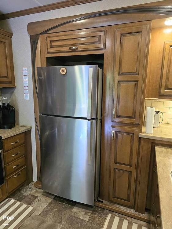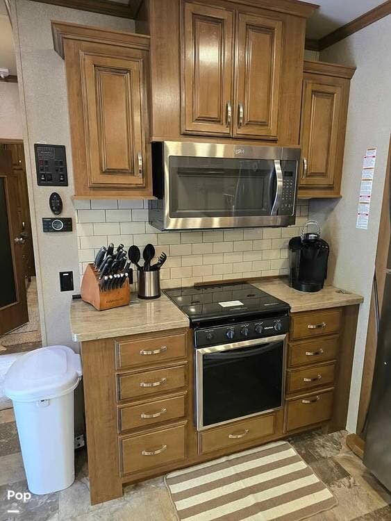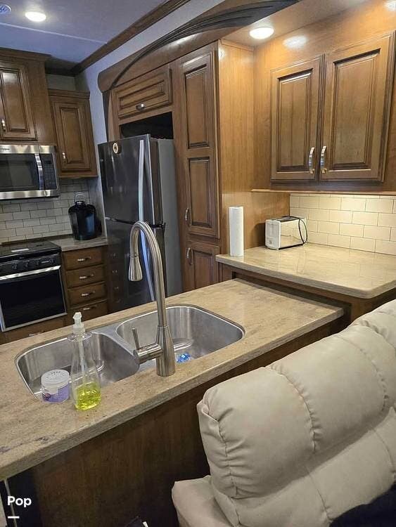 This 40-foot trailer features three slides, a large forward living and kitchen area, and a quaint dining space. The kitchen features stainless-steel appliances, ample storage, and counter space, along with a convenient pantry and spacious layout.