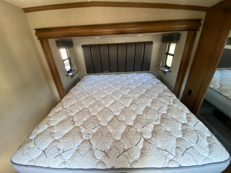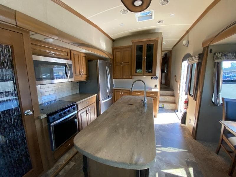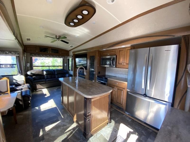 Bring all of the comforts of home with you when you choose to camp with this triple slide out Cedar Creek Hathaway Edition 36CK2 fifth wheel. In the kitchen there is plenty of work space to prepare your favorite meals. Clean up is a breeze at the island. Here you will find a double sink plus if you choose to add the optional dishwasher then your time cleaning up will be cut in half! When you are ready to call it a day, then head up to the private front bedroom. Here you will find a king bed and plenty of storage with the large wardrobe and dresser. This room has also been prepped for a washer and dryer so now you can easily keep up with your laundry while you are away from home!