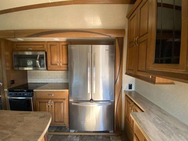 With any Forest River Cedar Creek Hathaway Edition fifth wheel you will find Nev-R-Adjust brakes which allow for improved stopping power in half the distance. There is also an E-Z Lube rubber equalization system and E-Z Lube heavy duty axles. In the bedroom you will find extra wide mirrored closet doors plus a walk-in closet and the radius ceilings give added headroom. The kitchen is everything that you would expect to find and more from the stainless steel 30" over the range microwave, to the recessed stainless steel large oven, you won’t be disappointed! If you prefer a bit more conveniences throughout then you will enjoy the Hathaway Edition Package which includes a 36" fireplace with remote and storage, solid surface LG counter tops with an oversized stainless steel sink, Congoleum Carefree designer flooring, On Demand hot water heater, and so much more!