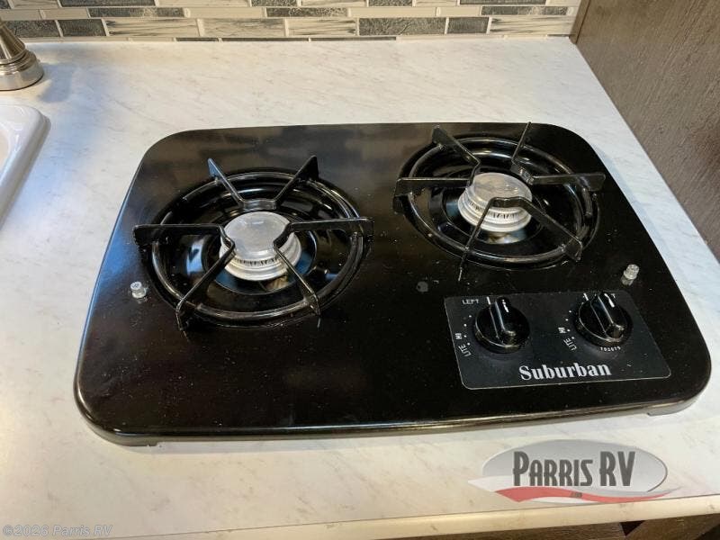 To the left of the entrance is a wardrobe, refrigerator, microwave, overhead cabinets, single sink, two burner range, and a pantry. The opposite side of the trailer offers a two person dinette with overhead cabinets.