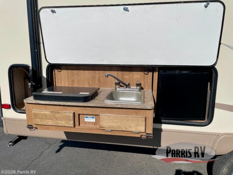 For the perfect couples coach come check out this Flagstaff Micro Lite 25FKS. You will enjoy the private rear bedroom, and if you camp with kids they can easily sleep at the 85" u-dinette. The kitchen area is along the front of this model. You will enjoy features such as solid surface countertops, and a one piece residential sink cover. Outside there is a pull-out kitchen with a two burner stove, sink, and a refrigerator. You will also find plenty of exterior storage and in the rear there is a sliding storage door, plus so much more!