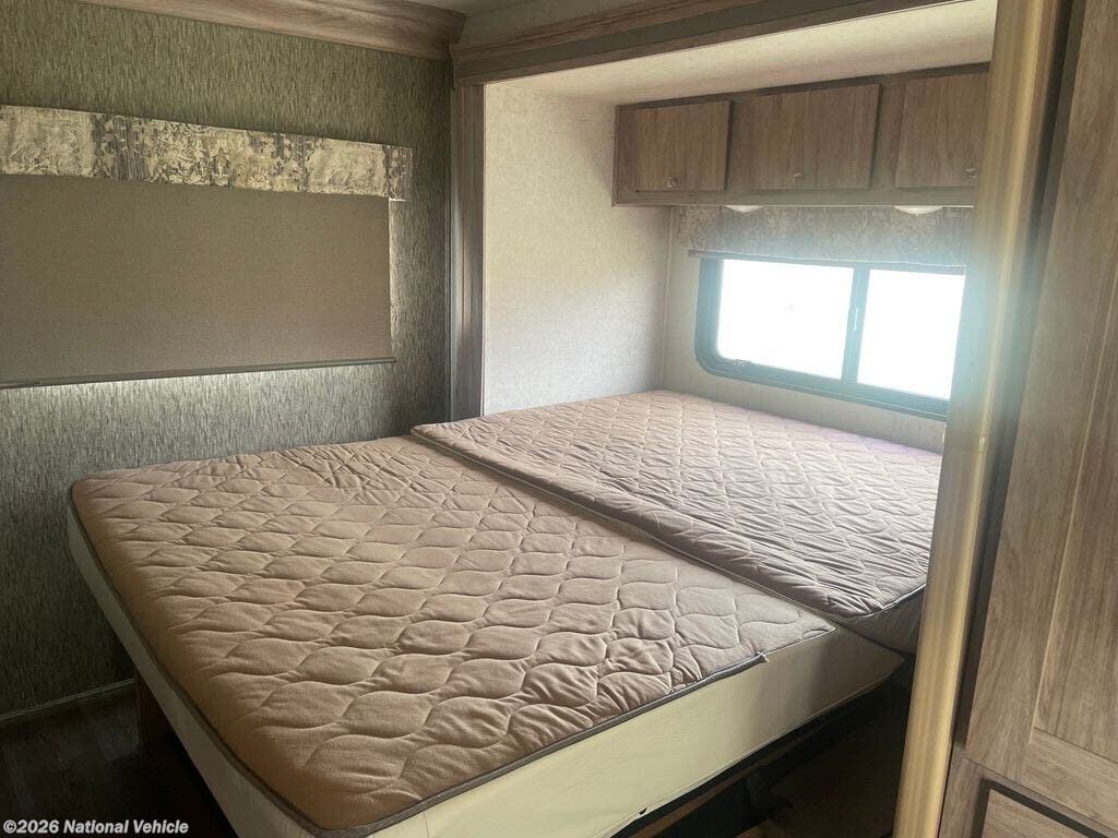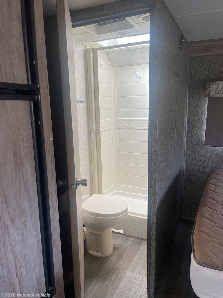 The rear corner bed provides a cozy and private sleeping space, while the cab-over bunk adds additional sleeping capacity for guests or family. A full bathroom with shower, toilet, and sink ensures you have all the comforts of home on the road.