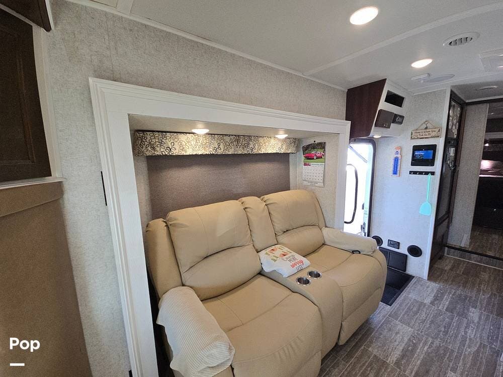 Inside is spacious and clean with a dual recliner sofa, 4 seat dinette (which converts to a sleep area), full kitchen with airfryer/convection microwave, a full bathroom, separate shower and rear bedroom.