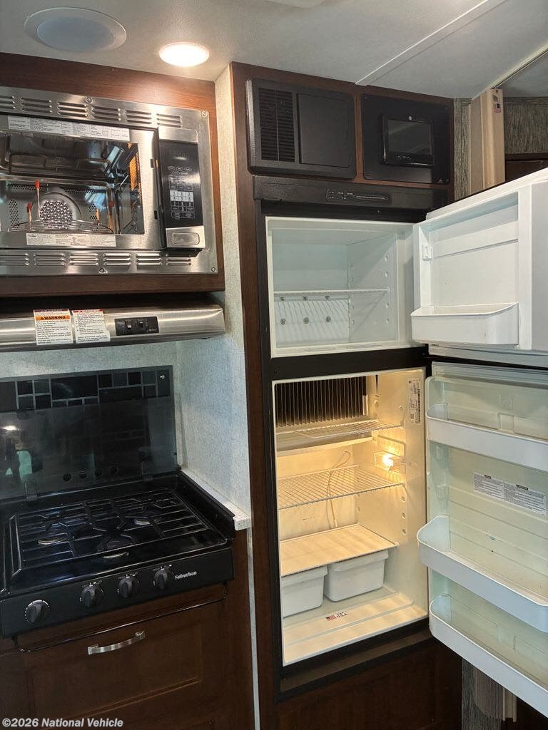 The kitchen is fully equipped for life on the road, featuring a 3-burner cooktop, a new microwave, refrigerator, solid-surface countertops, and ample cabinetry. Whether you?re preparing quick meals or cooking for the whole group, this kitchen offers both style and functionality.