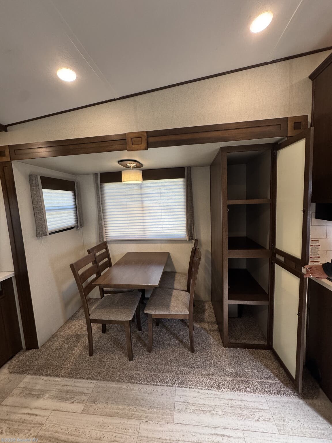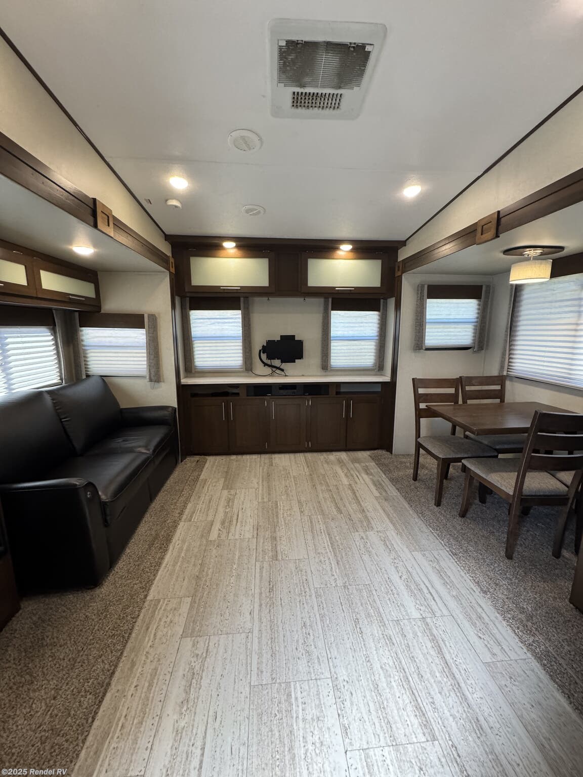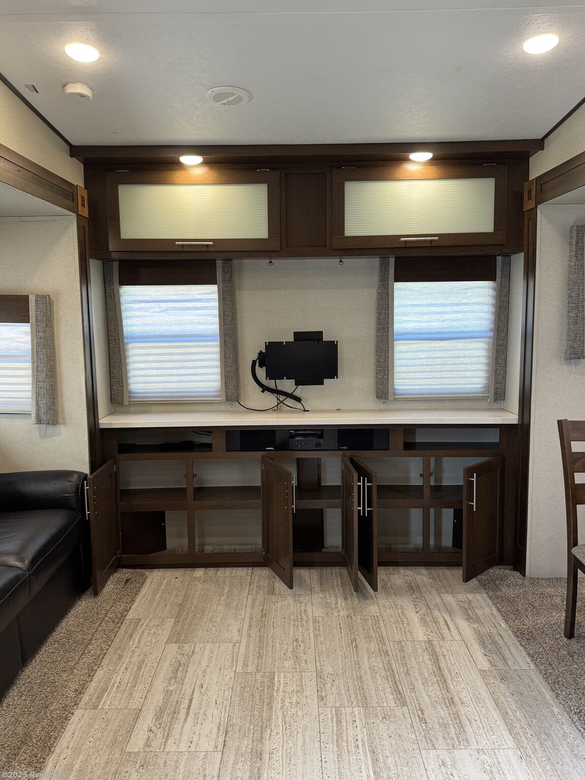 This fifth wheel is packed with entertainment and comfort-enhancing features, including an air conditioning unit with 15,000 BTUs, a surround sound system, TV, DVD player, CD player, exterior speakers, and an outside entertainment center. Stay cool and relaxed during hot days with the power roof vent and skylight, while the exterior awning provides shade and outdoor enjoyment. For added convenience, the RV has external amenities such as an outside shower, ladder, leveling jacks, and insulated construction for all-weather comfort.