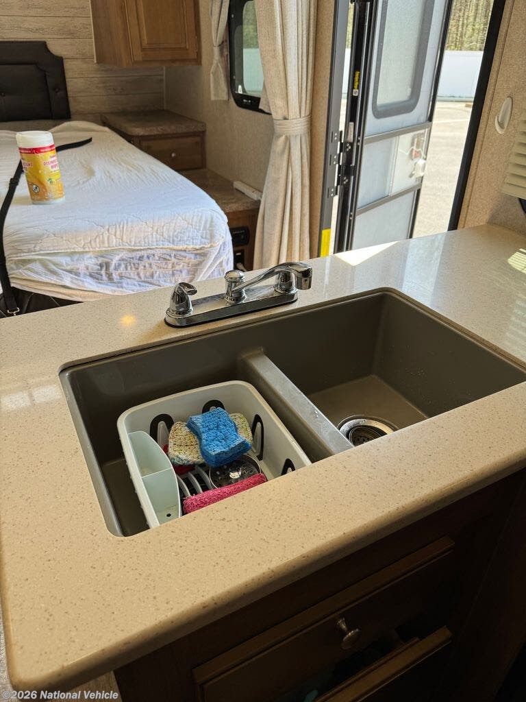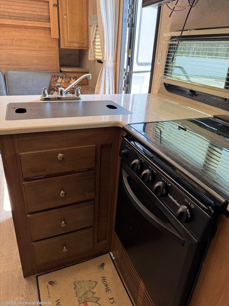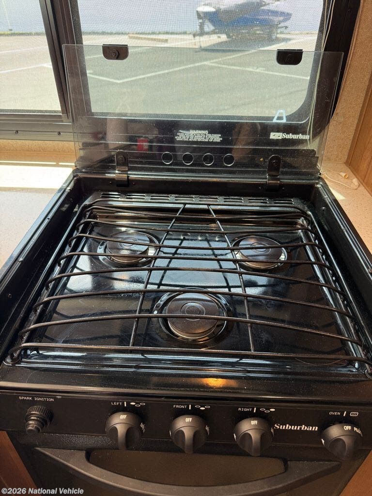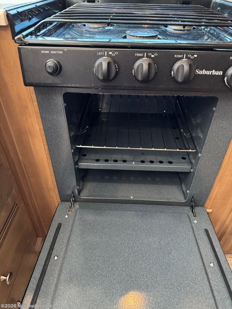 The kitchen is fully equipped for life on the road, featuring solid surface countertops, a three-burner stove, oven, microwave, refrigerator, and ample cabinet space. Whether you?re cooking a quick breakfast or a full dinner, everything you need is right at your fingertips.
