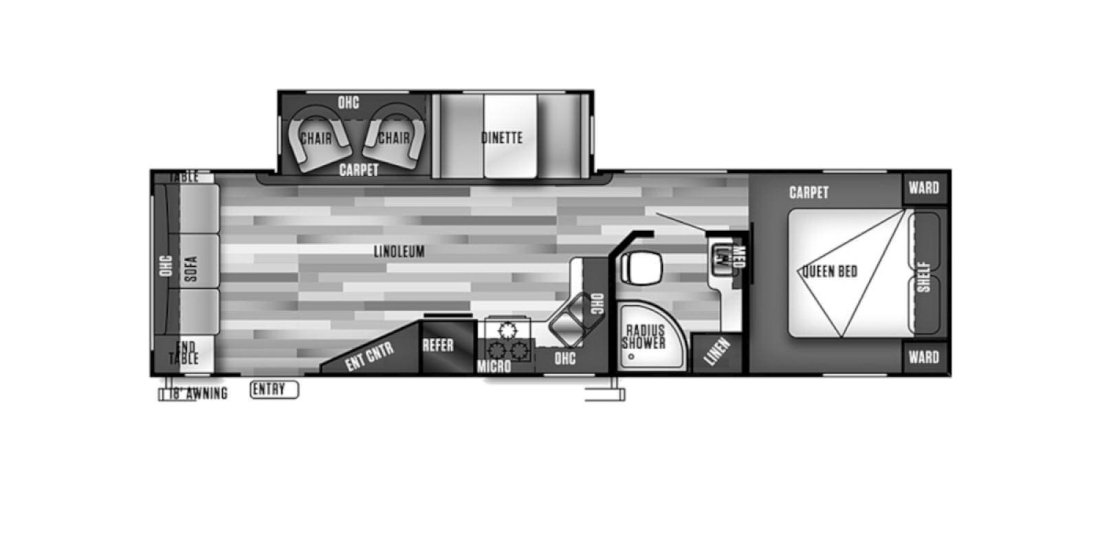 Features Include: Vinyl Patio Awning, Radius Entry Step, LED Lighting, Linoleum and Carpet, Digital Thermostat, Safety Glass Windows, Knife Rack, Deep Basin Sink, High-Rise Faucet, Systems Center, 4 Cube Speakers, Residential Mattress, Storage Shelf, Bedside 110v Outlets, Medicine Cabinet, Foot Flush Toilet, Hitch Light, Cambered Chassis, Powder Coated Frame, Diamond Plate Guard, Full Walk-On Roof