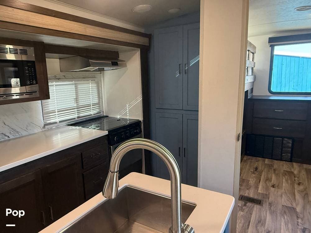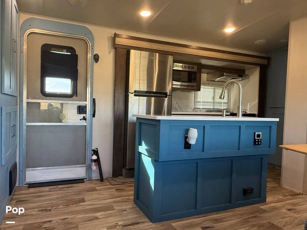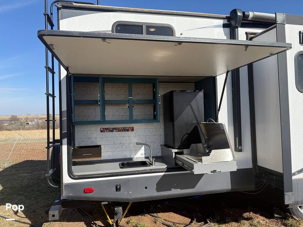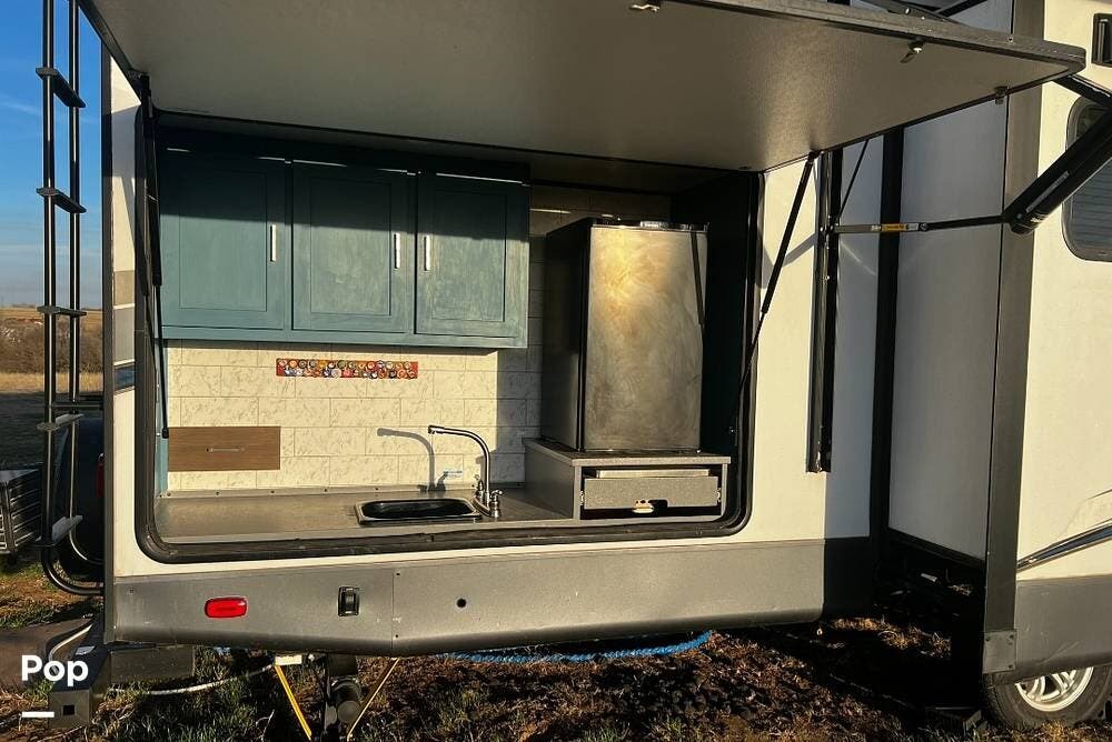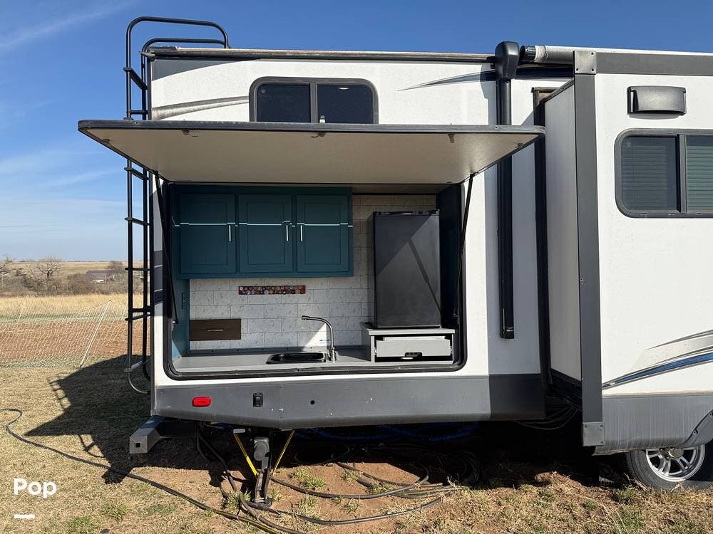 As you approach the trailer, you'll notice a large power awning that offers plenty of shade for outdoor activities. The exterior also features LED lights and several storage compartments for camping gear and personal items. The double entry steps make it easy to get in and out, and the outdoor speakers enhance the enjoyment of sitting outside.