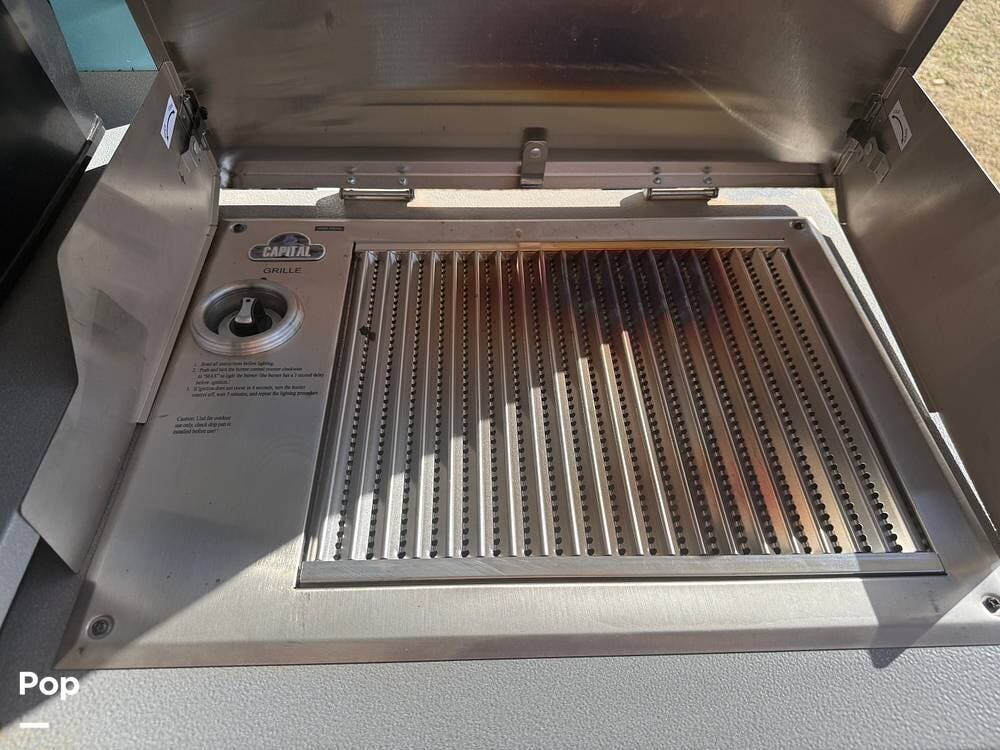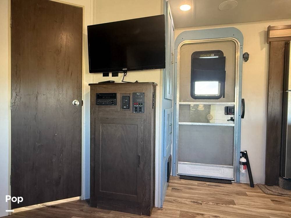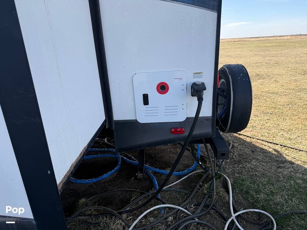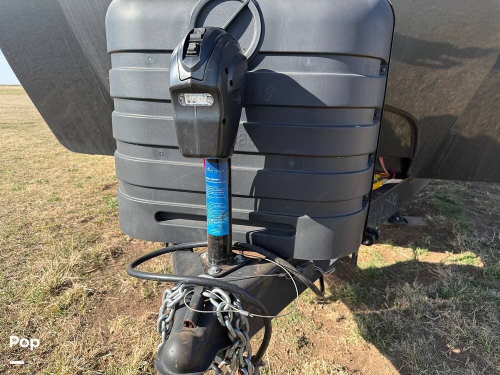 As you approach the trailer, you'll notice a large power awning that offers plenty of shade for outdoor activities. The exterior also features LED lights and several storage compartments for camping gear and personal items. The double entry steps make it easy to get in and out, and the outdoor speakers enhance the enjoyment of sitting outside.