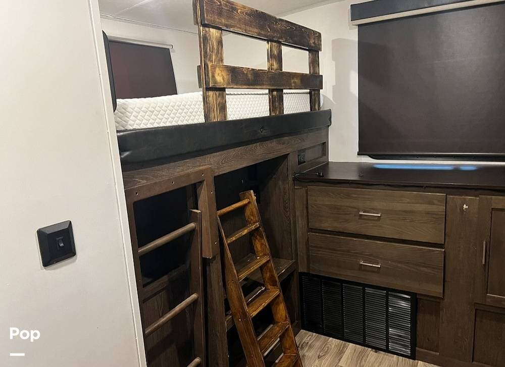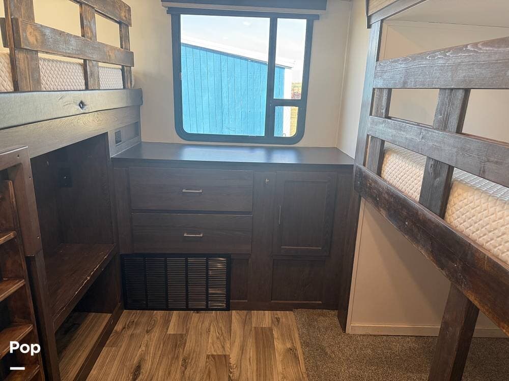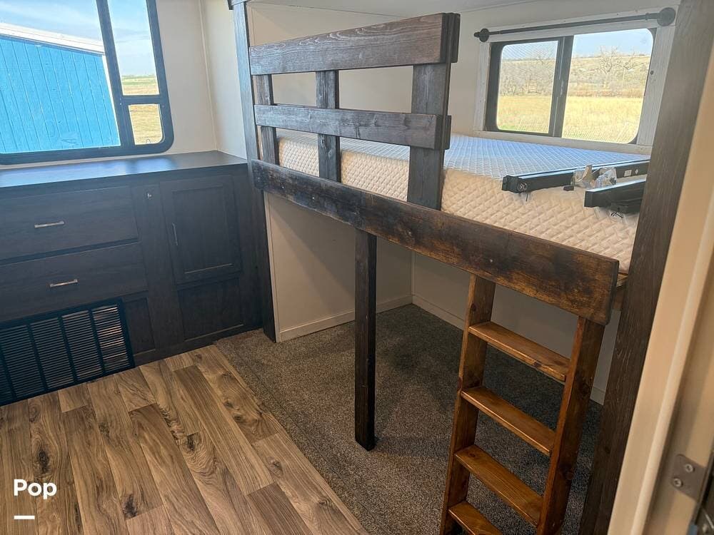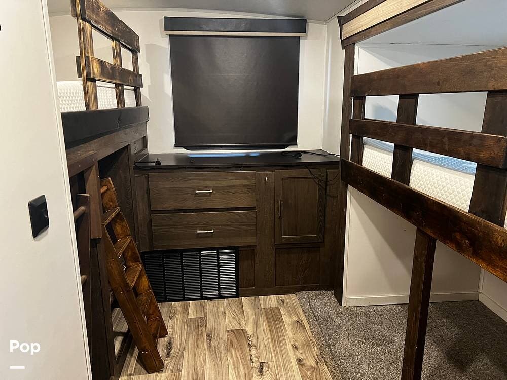 This trailer is perfect for families. It includes a bunkhouse in the back with two spacious bunks, giving kids or guests their space. This layout helps families bond while also providing some privacy.