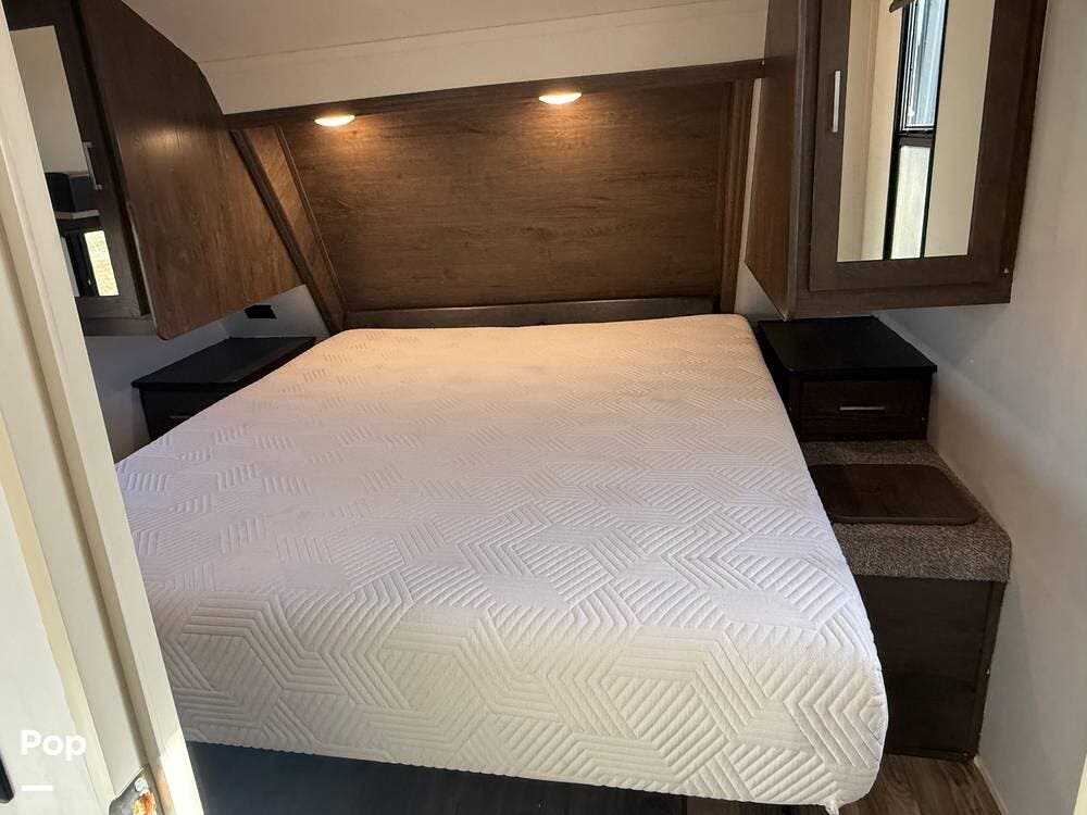 The main bedroom at the front has a queen-size bed for restful nights. There are nightstands and overhead storage to maximize space, and a sliding door for added privacy. The bathroom is nearby, featuring a shower, porcelain toilet, and sink for convenience.