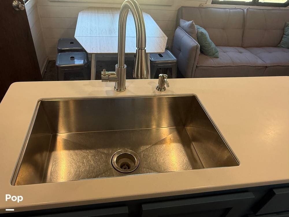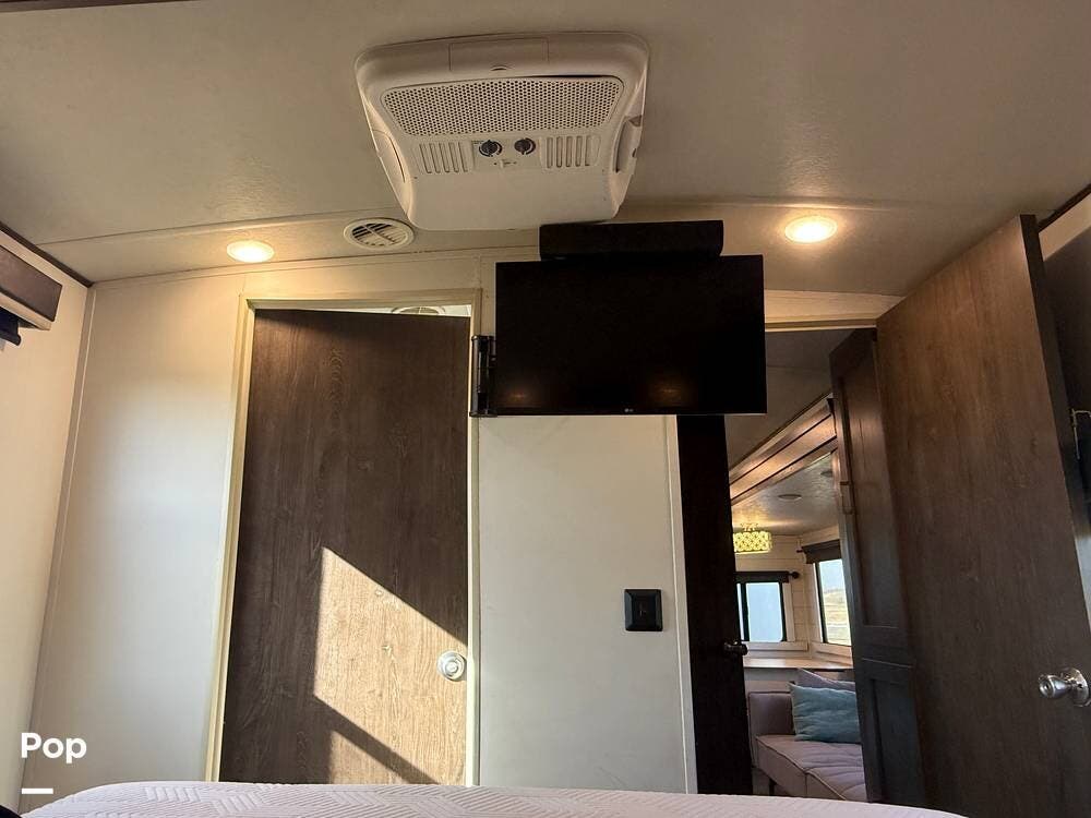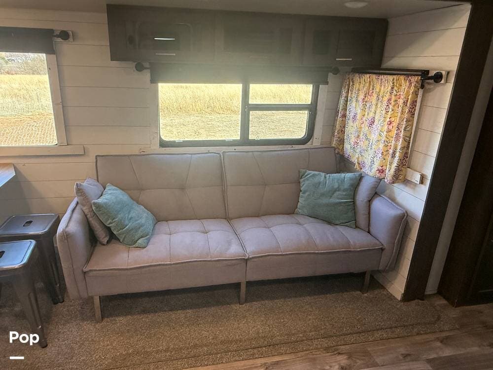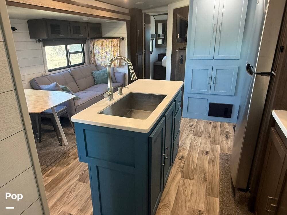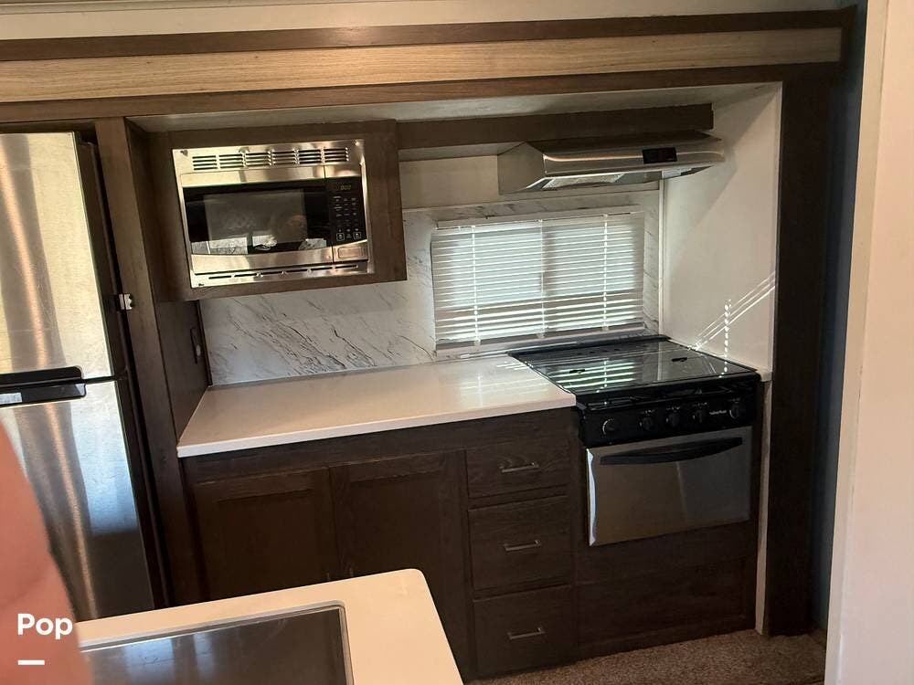 Inside, the 2018 Salem Hemisphere GLX 300BH has a welcoming living space filled with modern features. The living area includes a comfortable sofa and a dinette that can be turned into extra sleeping spaces. Large windows let in natural light, making the interior open and bright.