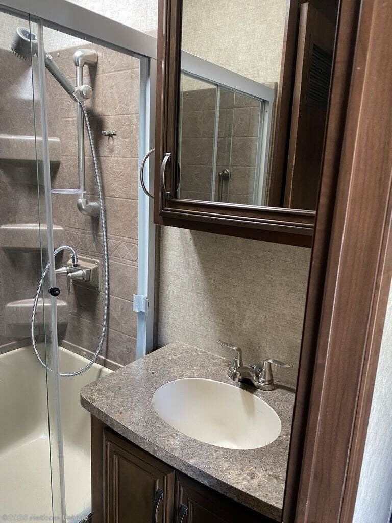 The kitchen is built for real living, loaded with residential appliances, a stainless steel refrigerator, solid surface countertops, and a functional layout that makes cooking on the road effortless. Whether you?re hosting guests or enjoying a quiet night in, this space delivers both form and function.
