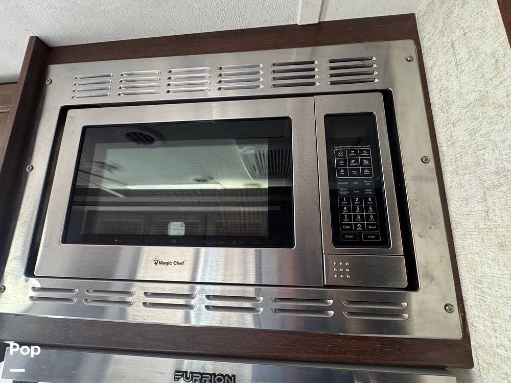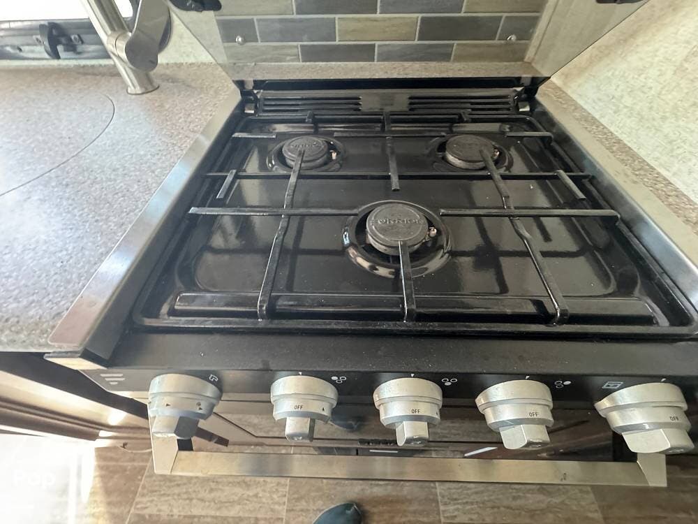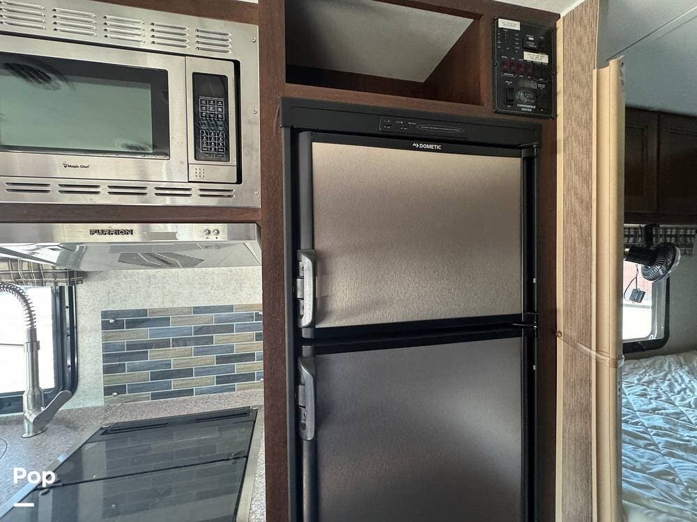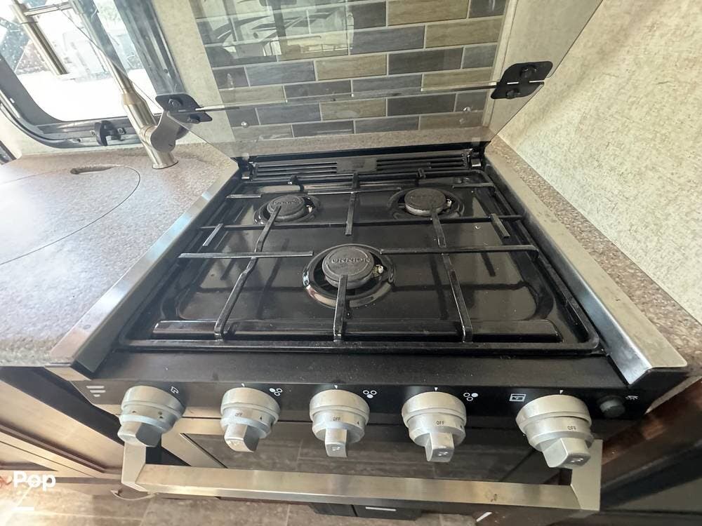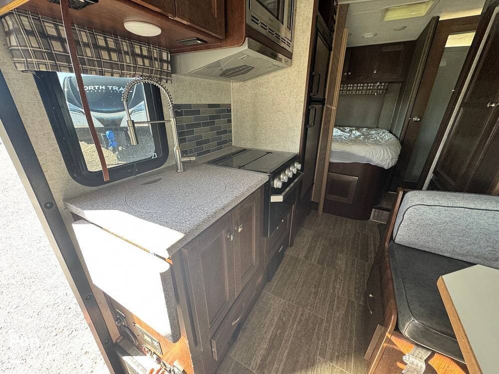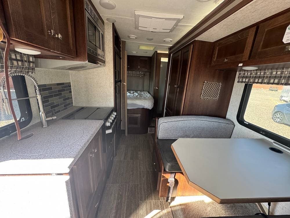 You will see a comfortable dinette with two bench-style seats upon entering the RV. Across is the galley with a convection microwave oven and a three-burner stove. You will also find a good-sized refrigerator.