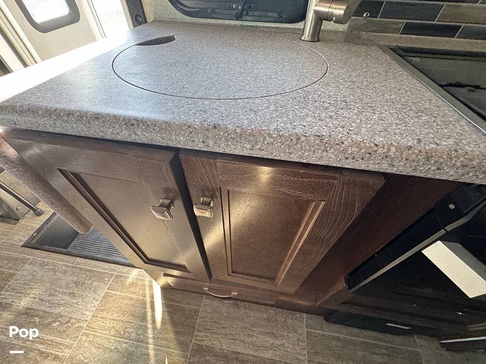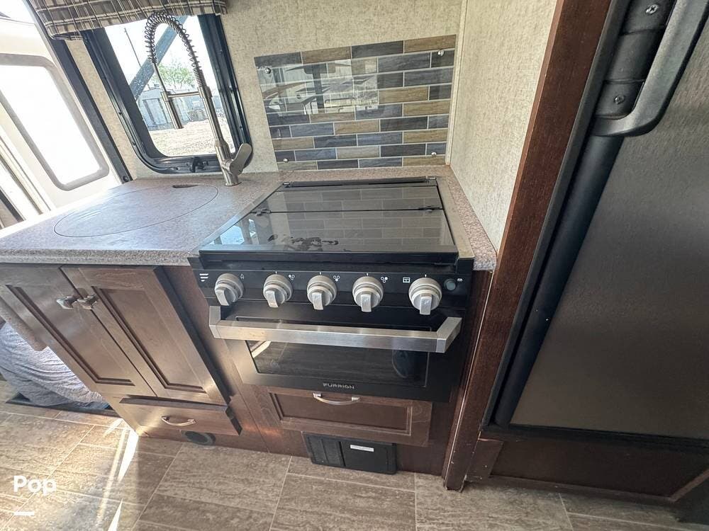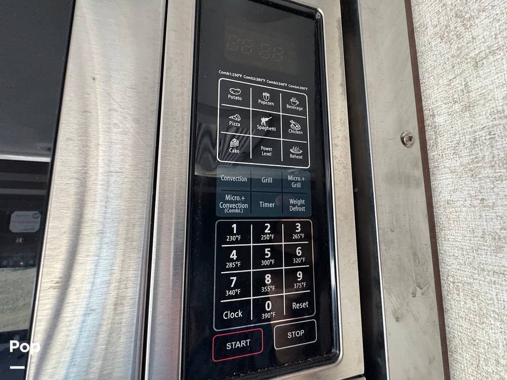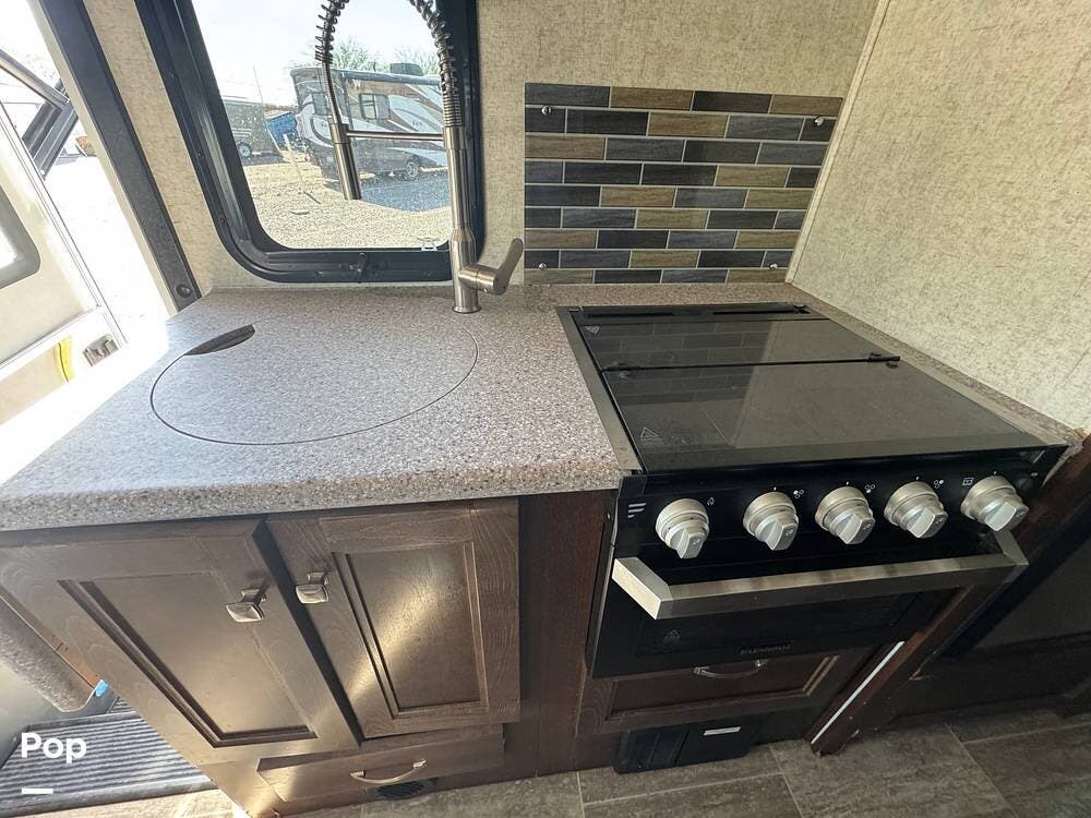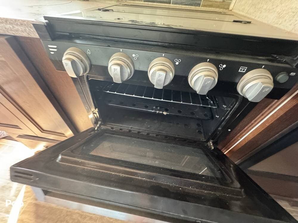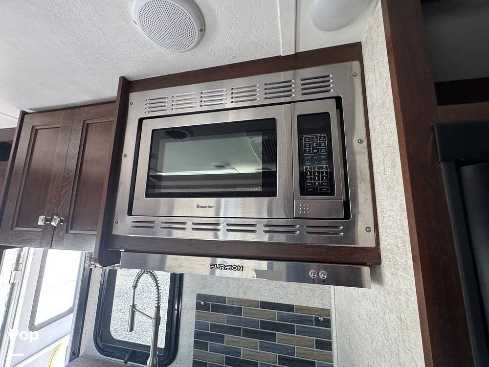 You will see a comfortable dinette with two bench-style seats upon entering the RV. Across is the galley with a convection microwave oven and a three-burner stove. You will also find a good-sized refrigerator.