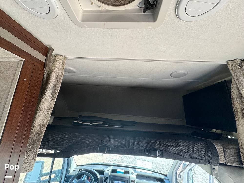 Above is a cab over a bunk with a ladder and a TV.