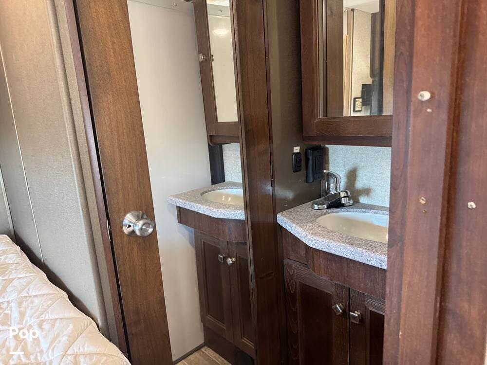 When you return to the RV, the bed is in the right corner, with the vanity and sink nearby.