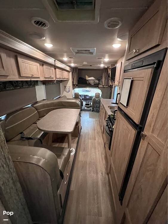 Step into this well-kept Class C RV, and you're greeted by a cozy cockpit with two captain's chairs and a convenient overhead bunk for additional sleeping space.