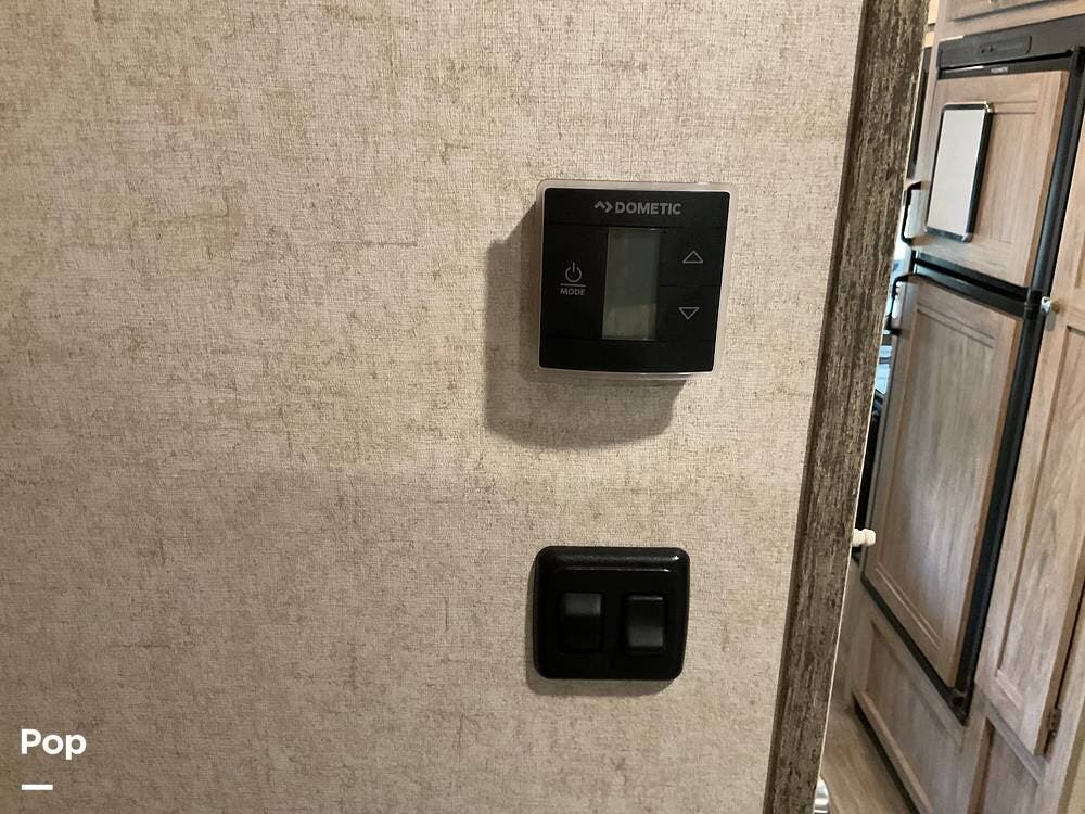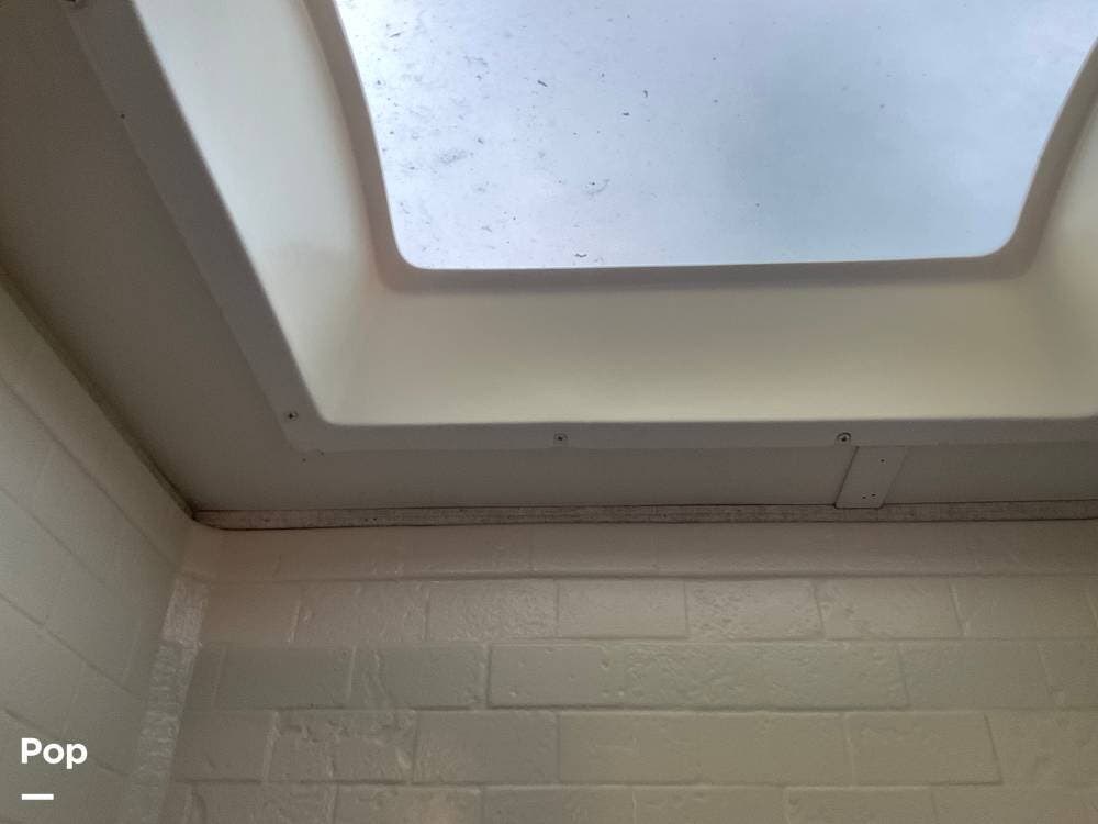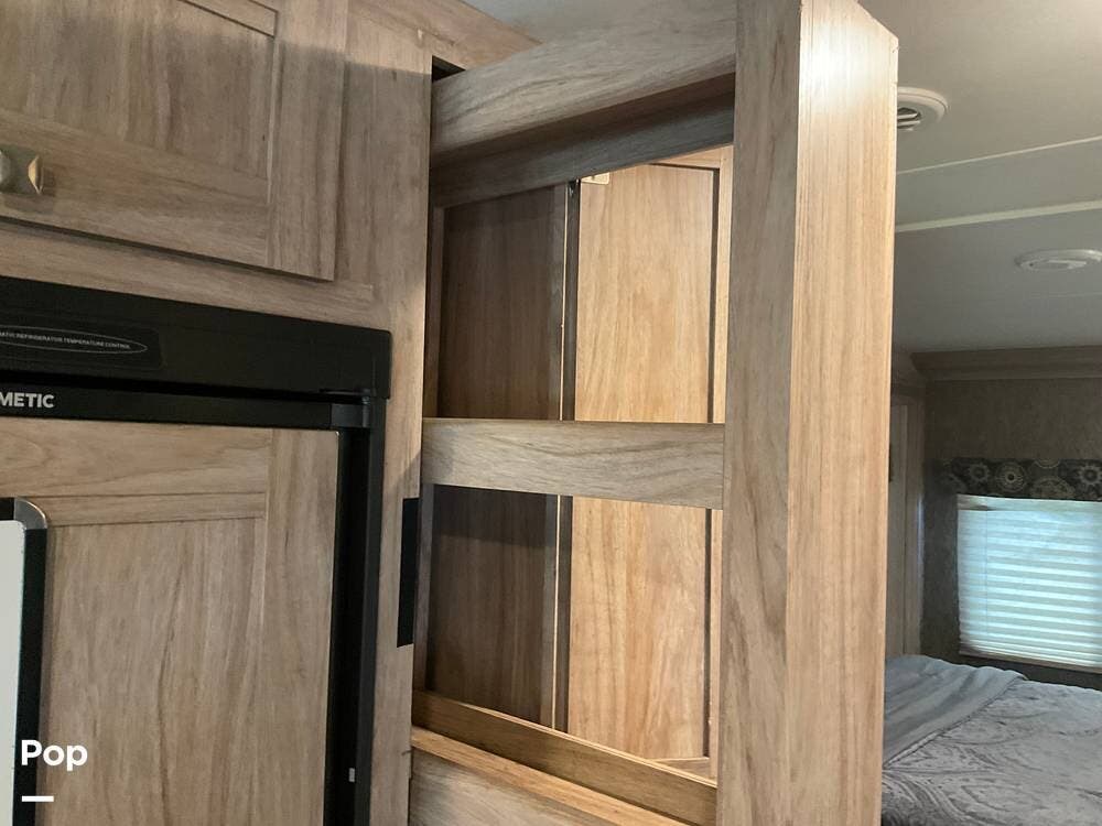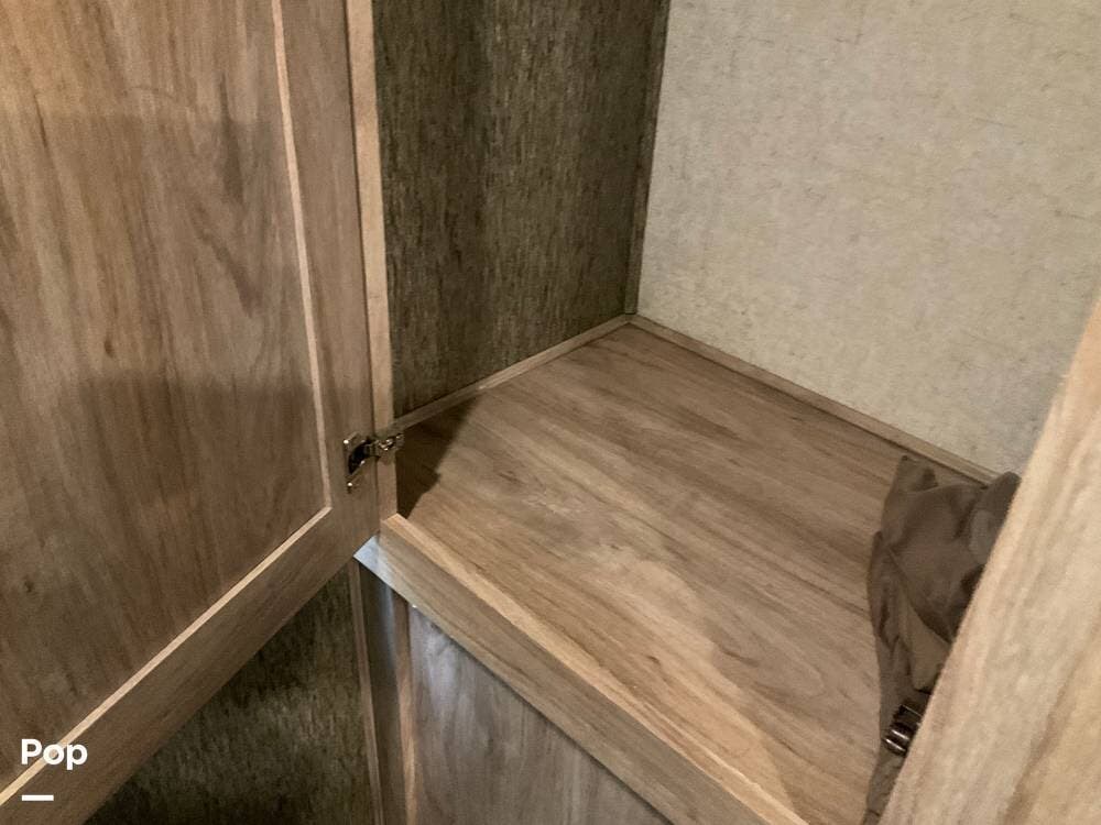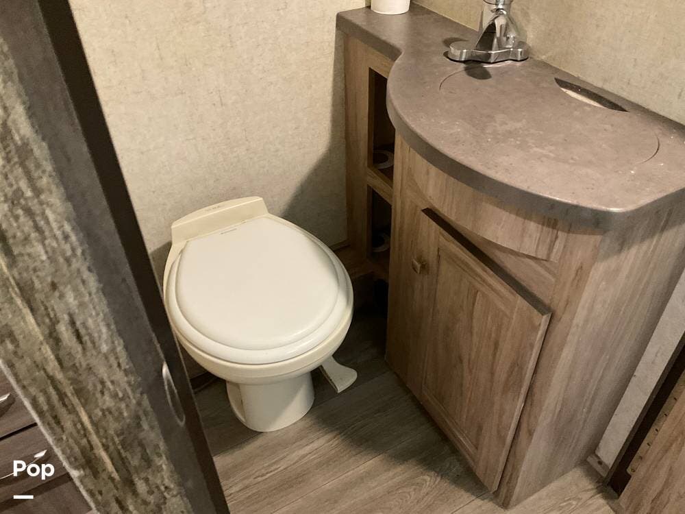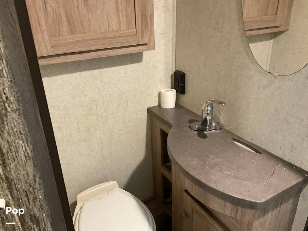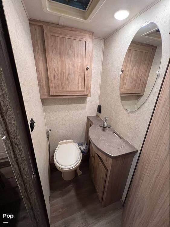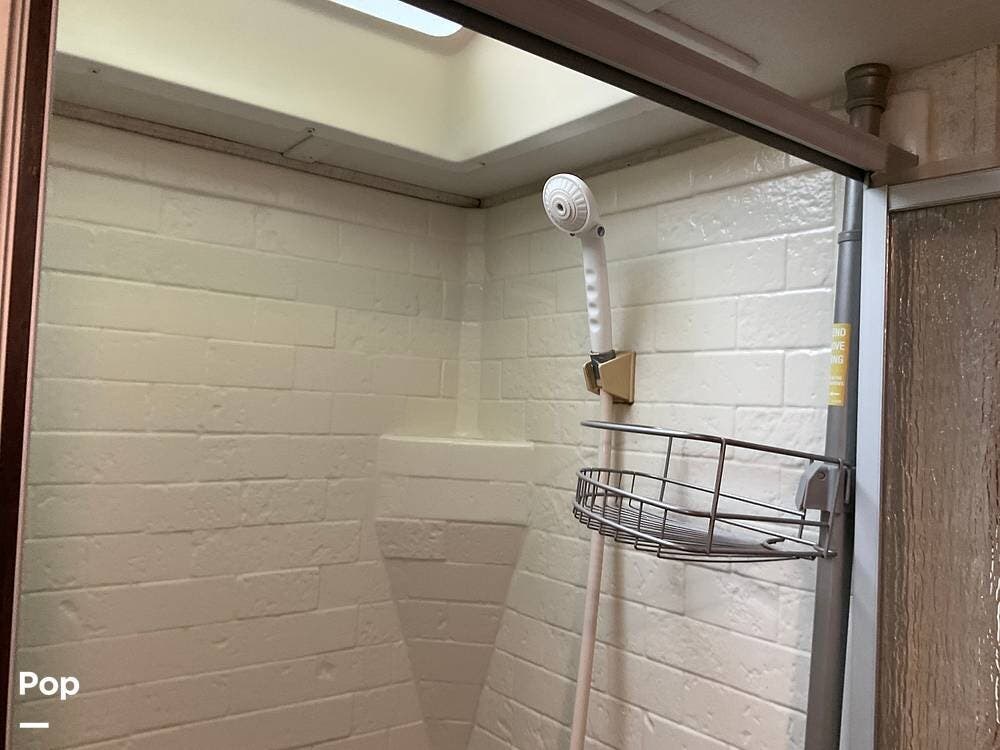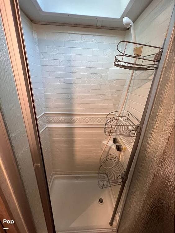 Continuing through the RV, the bathroom area is split: the shower is on the left, while the sink and toilet are on the right.