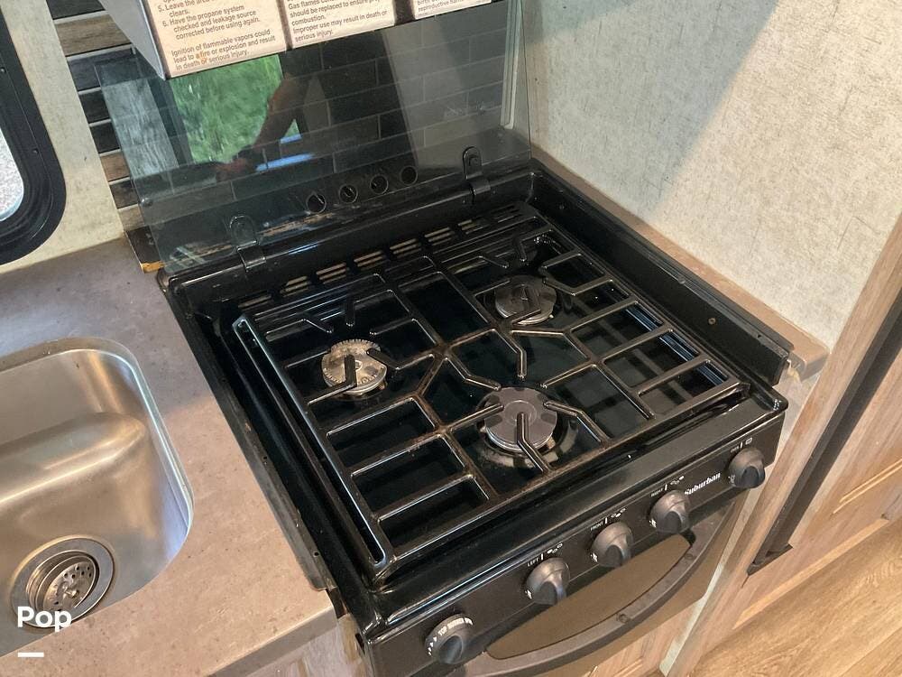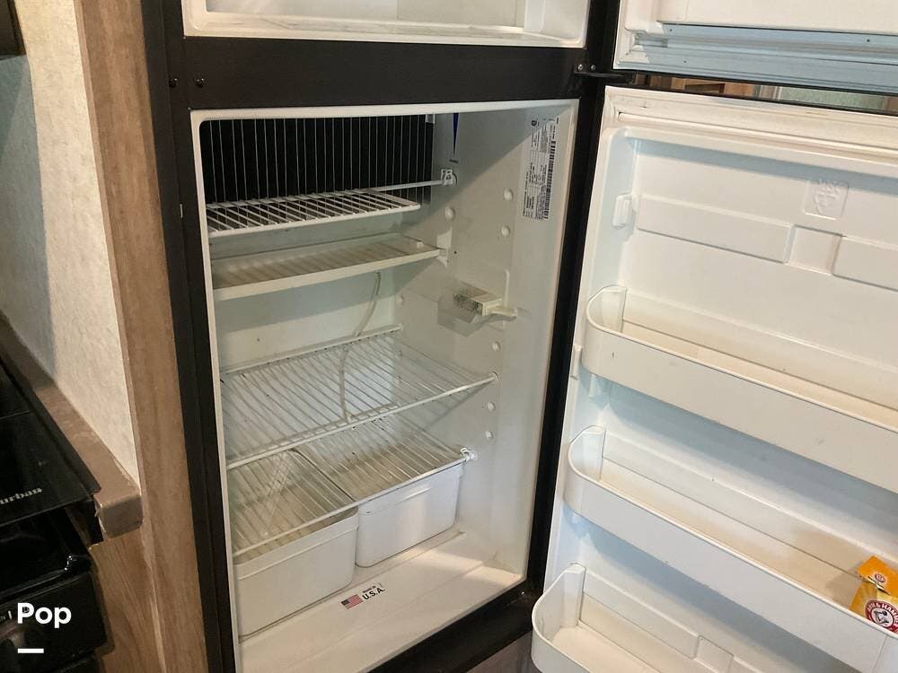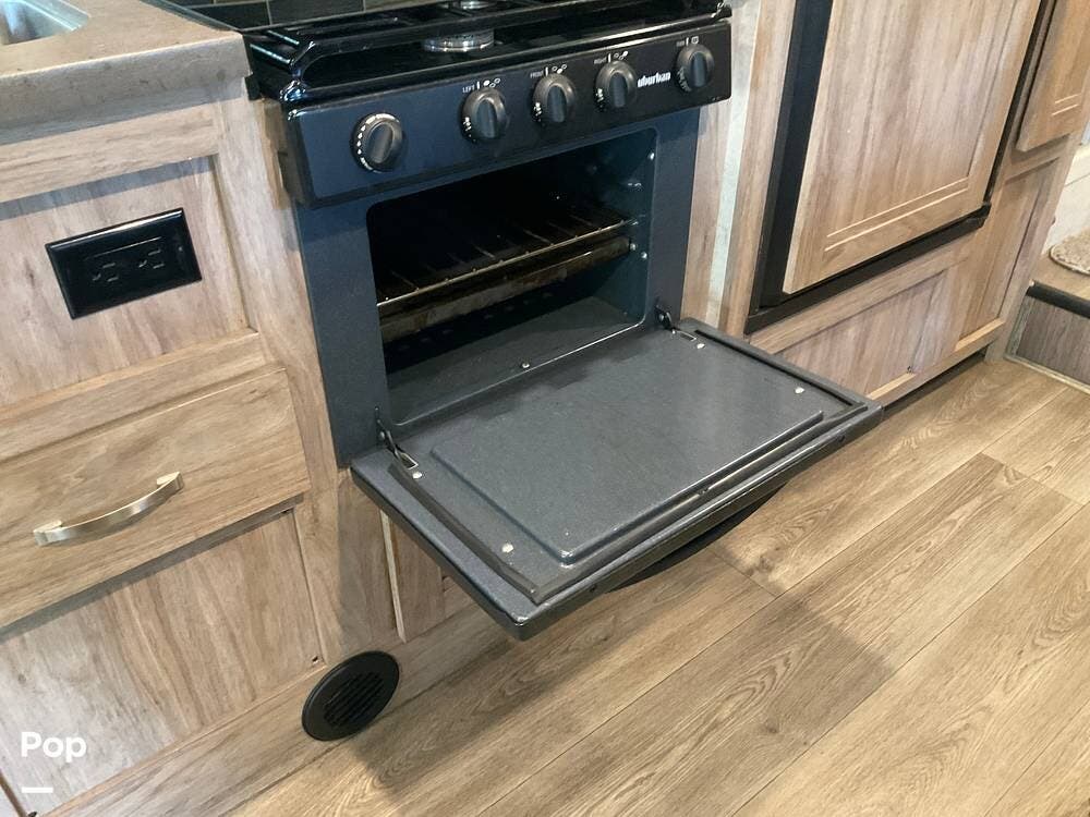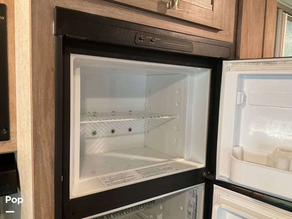The kitchen is well-appointed with a double stainless steel sink, microwave, stove, and a refrigerator/freezer combo. Adjacent to the kitchen is a spacious dinette that converts into a 44" x 82" bed and includes seating with three to four seatbelts.