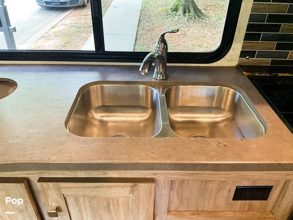 The kitchen is arranged to keep everything within easy reach and includes a double stainless steel sink, microwave, stove, and refrigerator/freezer combination. There is good cabinet and counter space for a coach of this size, making it easy to prepare meals and stay organized while traveling.
