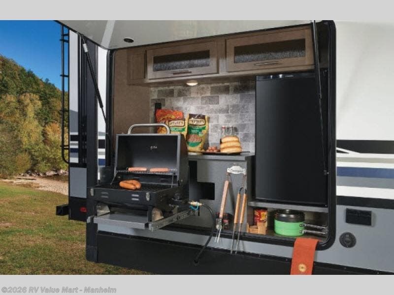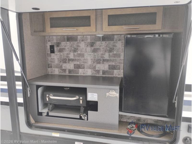 Are you ready for a great time away from home while relaxing in this triple slide out Surveyor 33KRLOK travel trailer? With two kitchens - one inside and one outside, the hardest decision that you will have to make is where you will fix your meals. If you enjoy grilling out then the outside kitchen is sure to be a draw for you. Inside you can relax around the free-standing dinette, the theater seats, or the sofa. Your perishables can be stored in the residential refrigerator and the island has a double sink with a high rise faucet plus extra counter space so you have more room to work. When you are ready to turn in for the night then come enjoy the comfortable king bed and more!