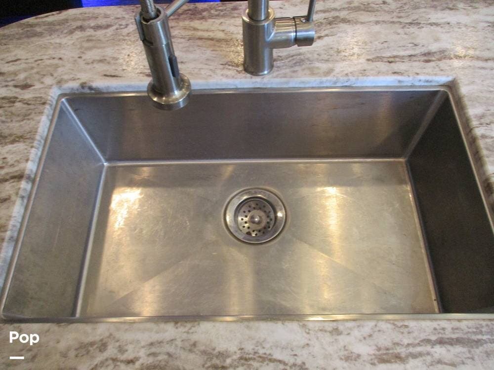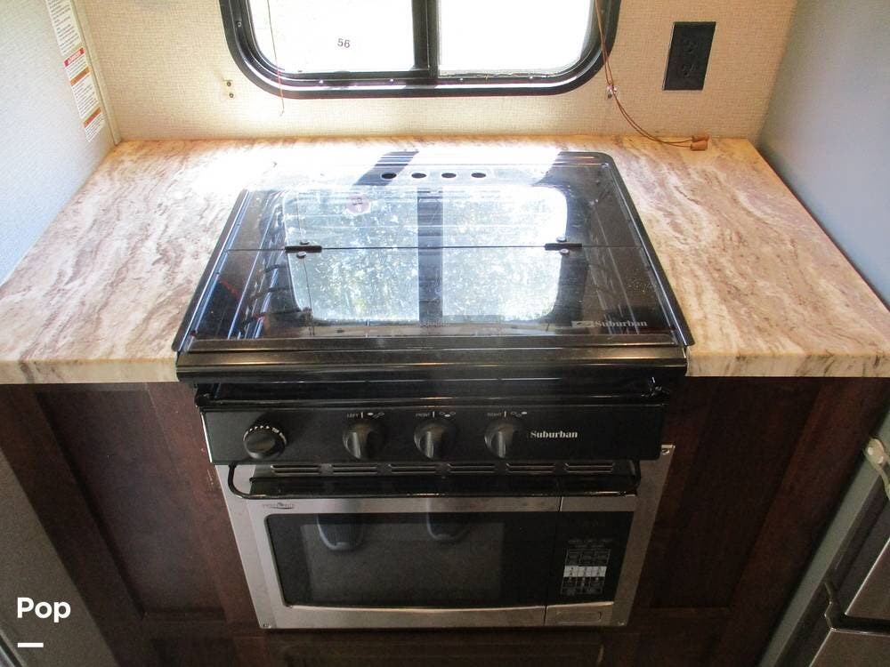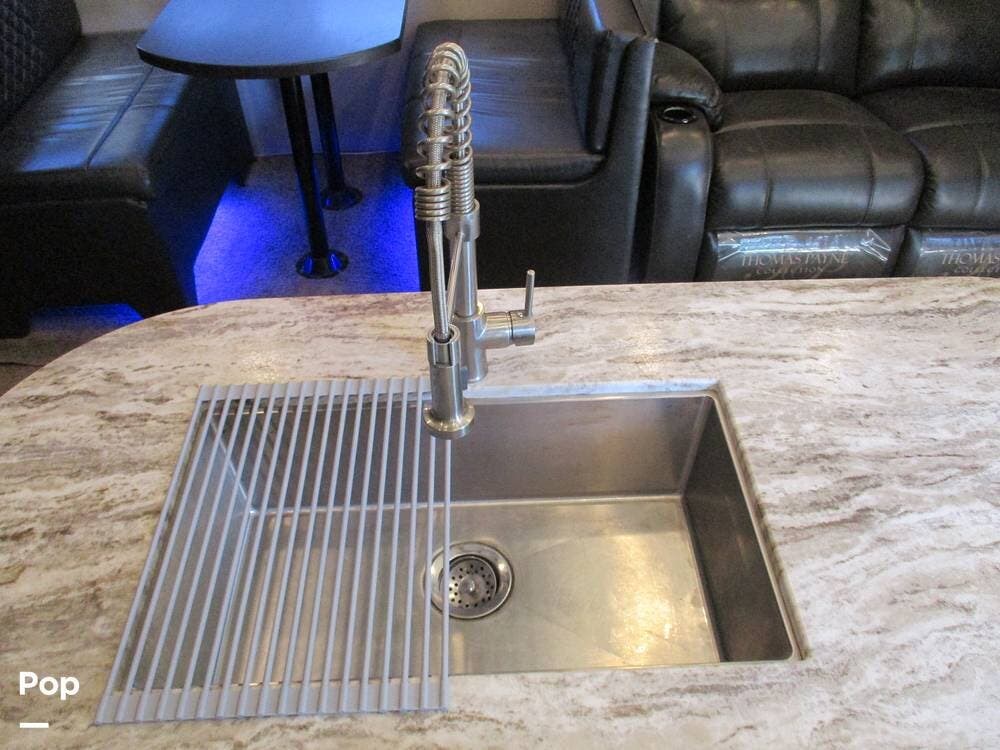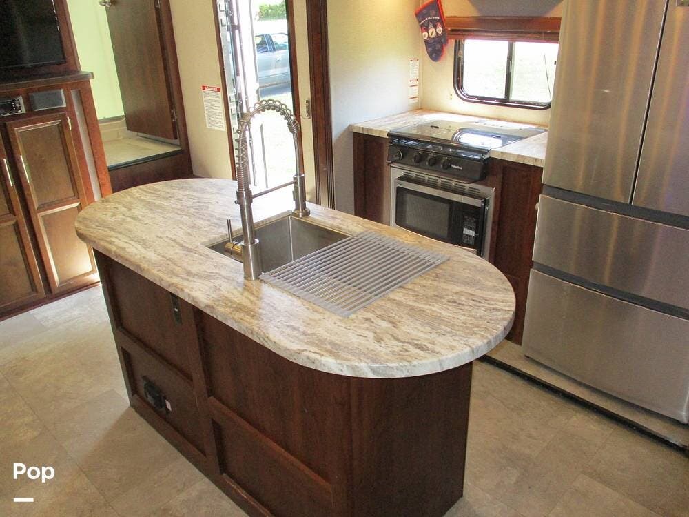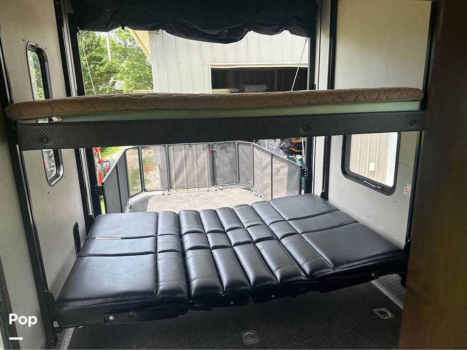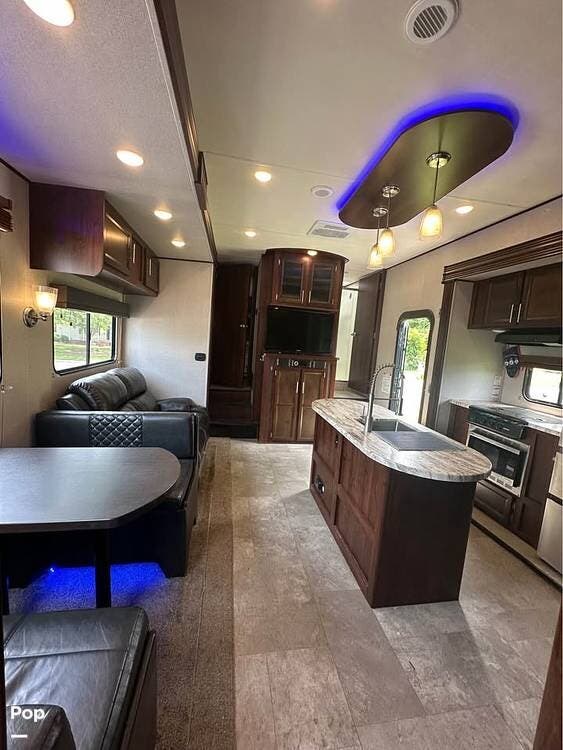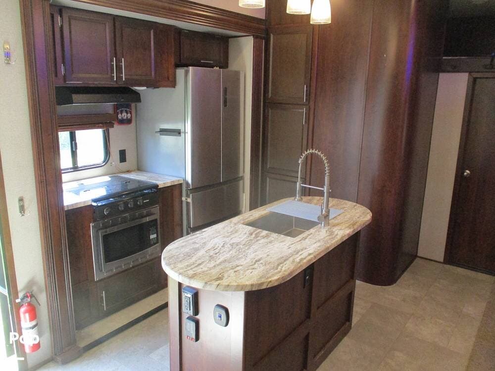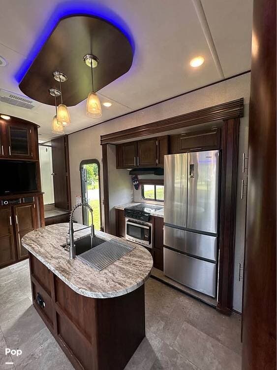 The kitchen provides a kitchen island with a sink. This is a great place for meal prep or entertaining. The kitchen also includes a stove, oven, microwave, and a refrigerator with a freezer. Off the kitchen is a loft bed area that the kids will love.