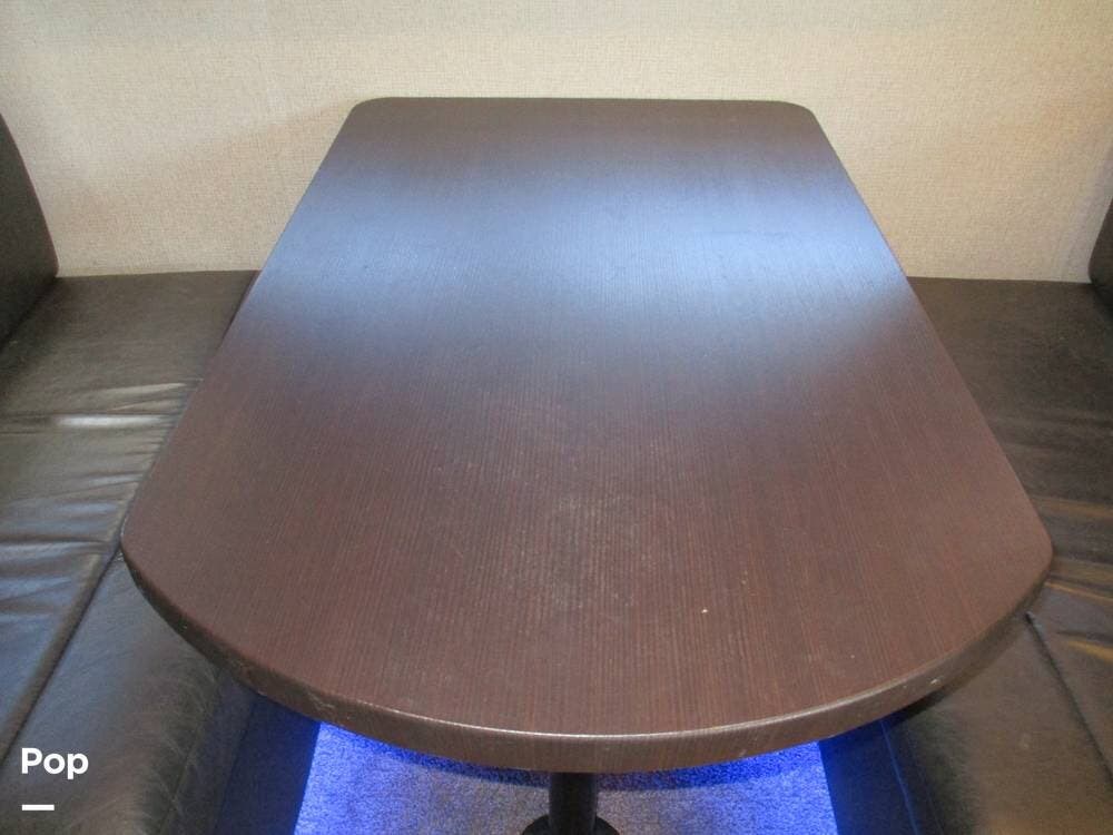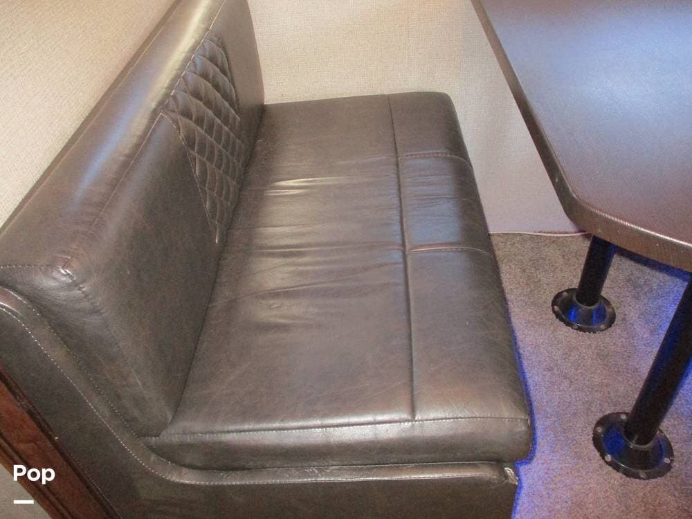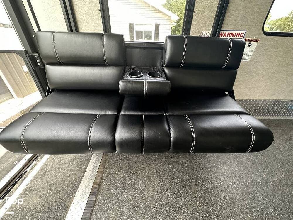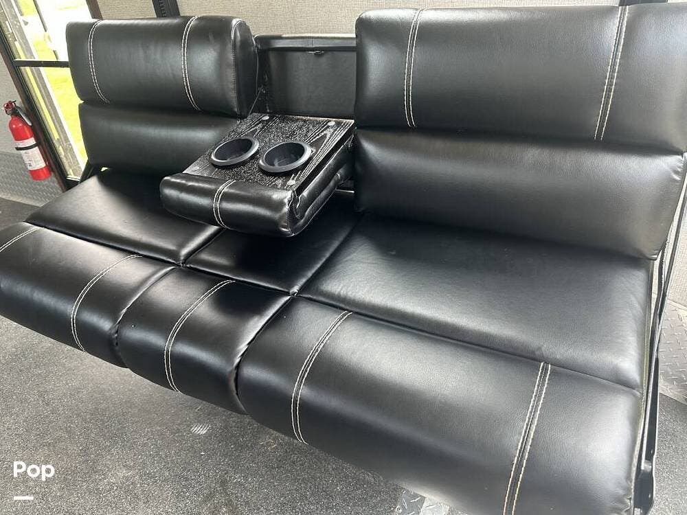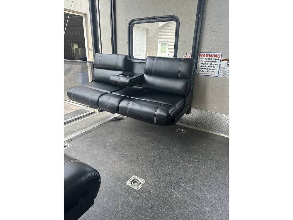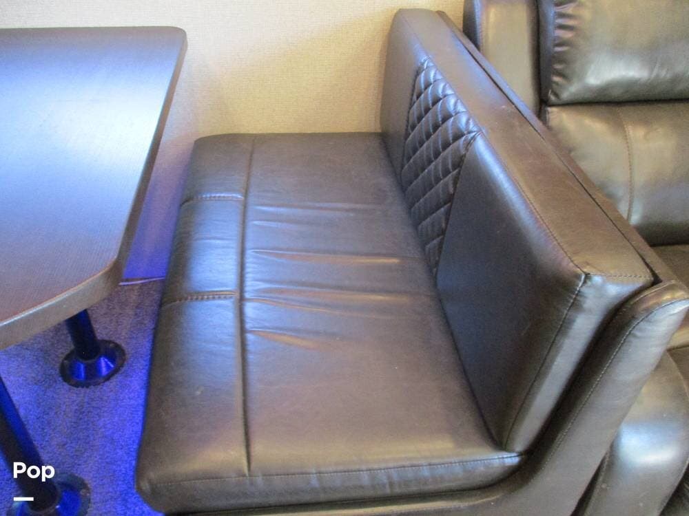 The main living area features a sofa with recliners and a booth-style dinette that doubles as a sleeper. Relax and enjoy the entertainment center, featuring a large flat-screen TV and a fireplace below.
