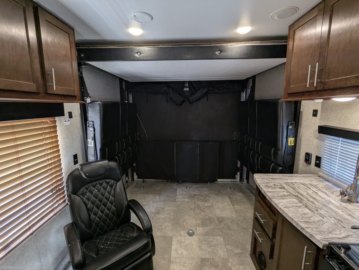 - 13'6" Garage with Flip-Up Sofas: Perfect for storing dirt bikes or ATVs, with two sofas and a drop-down queen bed for versatile sleeping or lounging.
