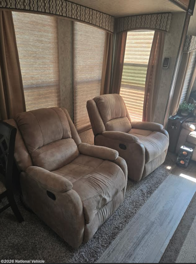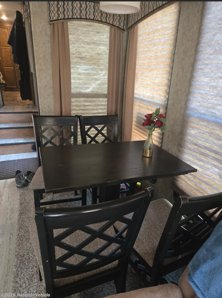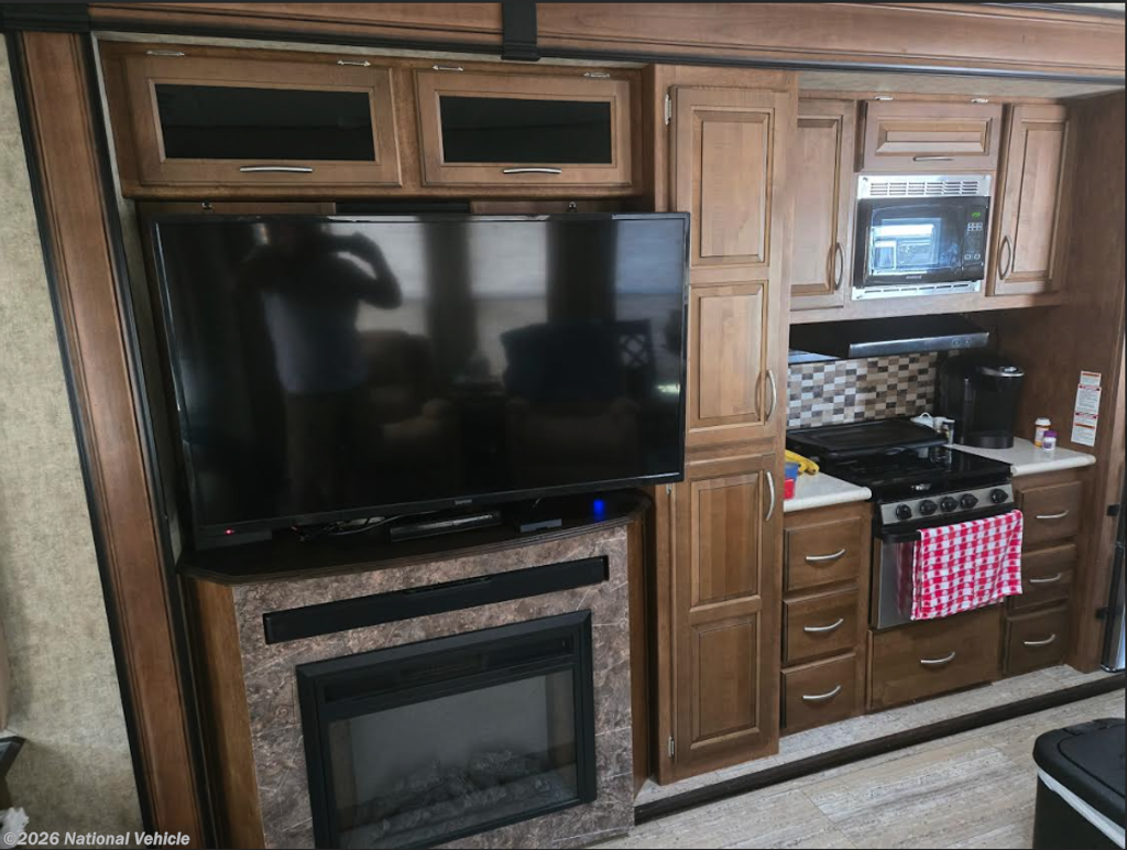 The kitchen is built for real cooking - not just camping. You?ll love the center island for extra prep space, the gas stove, microwave, and the impressive double-door refrigerator with two separate freezer drawers. There?s abundant cabinetry and storage throughout, plus a residential-style dining table with four chairs, giving you a true at-home dining experience.