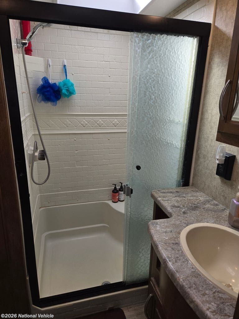 The bathroom is spacious and functional, offering a sink, shower, and toilet, with room to move - no cramped camper feel here.