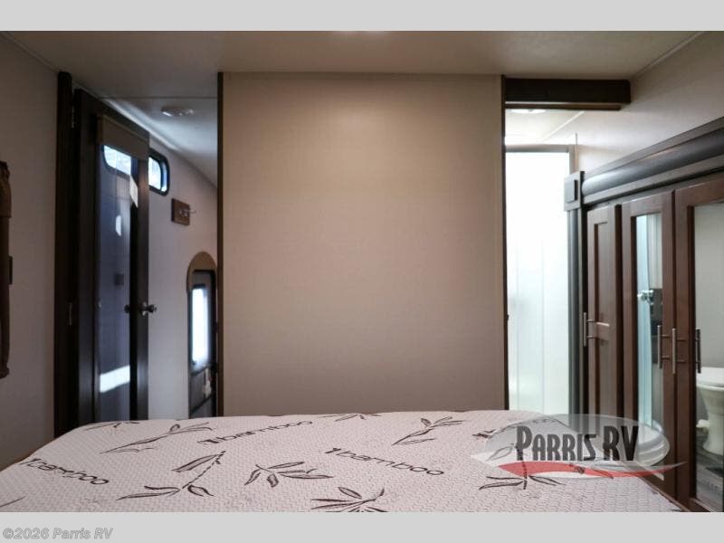 Step up to the bathroom and bedroom area. In the bathroom you will find a toilet, an overhead shelf, a 32" radius shower, plus a sink and medicine cabinet. A linen cabinet is part of the slide out which extends into the bedroom, and a sliding door closes off the bathroom from the front bedroom.
