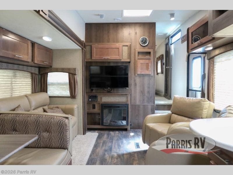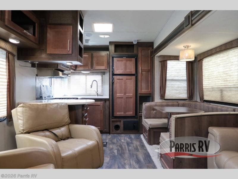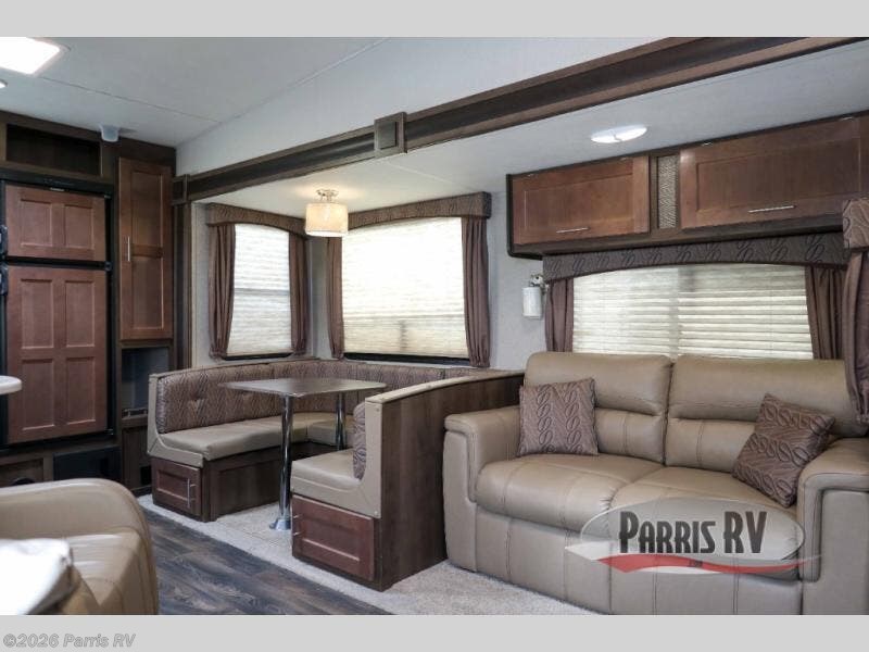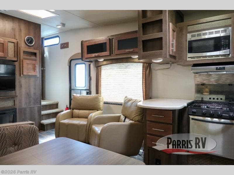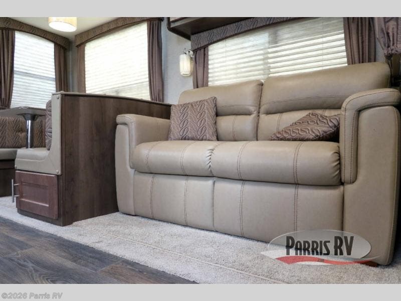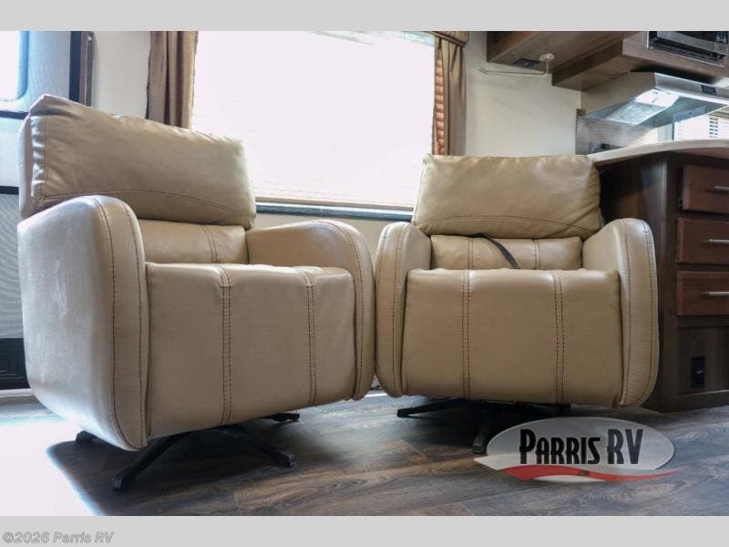 To the left of the entrance there are two lounge chairs or you can choose optional recliners. The opposite side of the fifth wheel has a slide out which really helps to open up the floor space. Within the slide out there is a sofa, an overhead cabinet, and a u-shaped dinette, or you can choose an optional free-standing dinette. Both the sofa and dinette easily convert into additional sleeping space at night. Adjacent to the slide out, along the interior wall is where you will find an entertainment center.