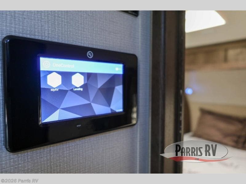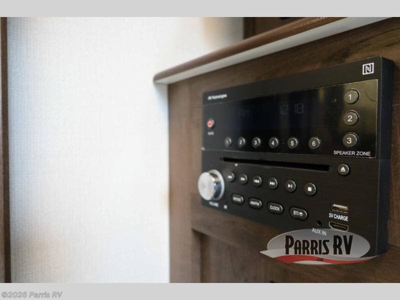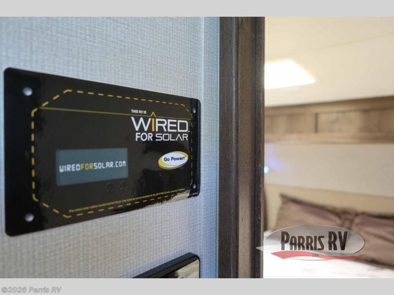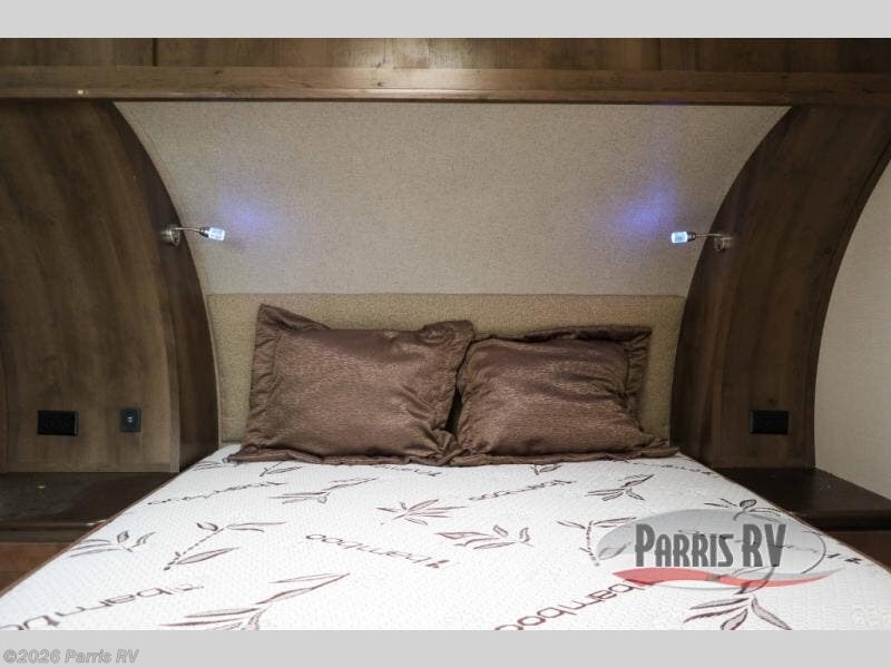 In the front bedroom there is a queen bed, two nightstands, and an overhead cabinet. The slide out along the road side features a wardrobe, a desktop, and drawers. You will also find a USB/12 volt charging center here.