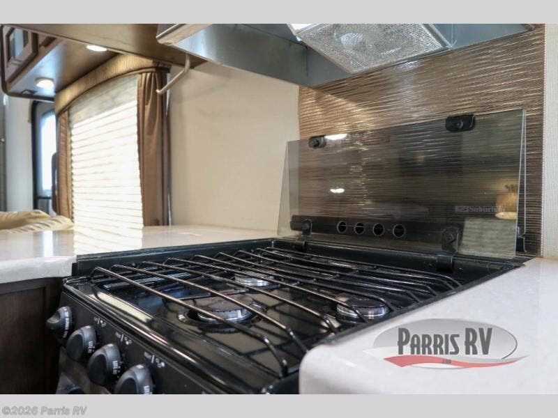 The kitchen area is located along the rear of this model. Just past the lounge chairs there is a L-shaped counter with a three burner range and a microwave. Continuing along the rear wall, you will find a double sink, refrigerator, and a pantry.
